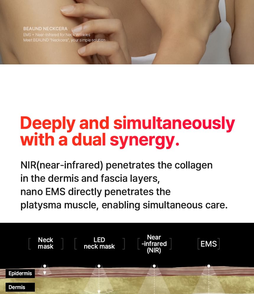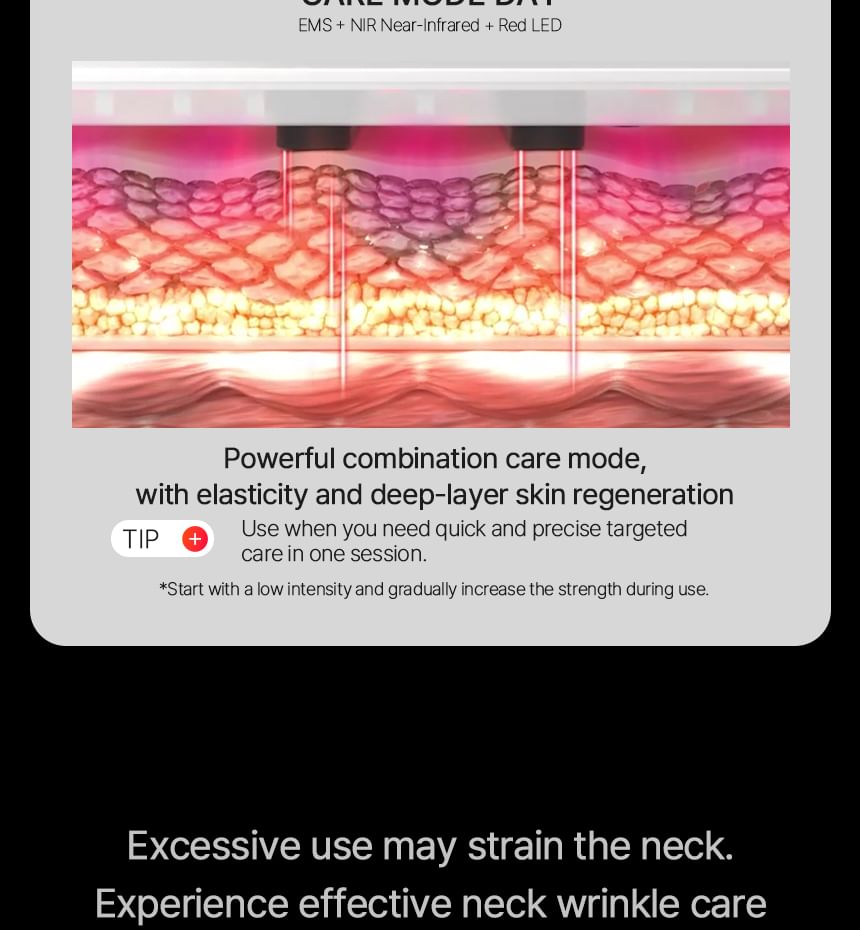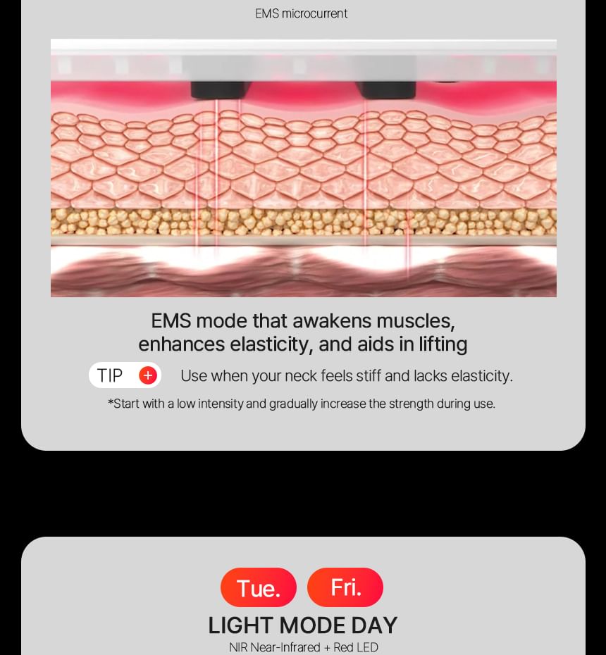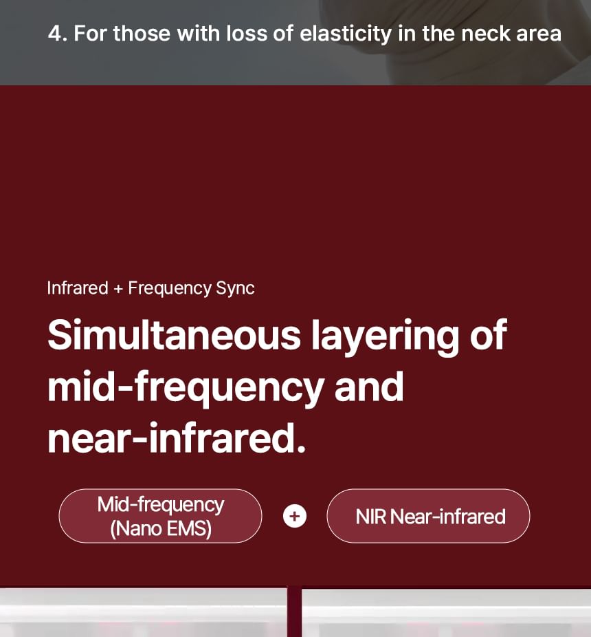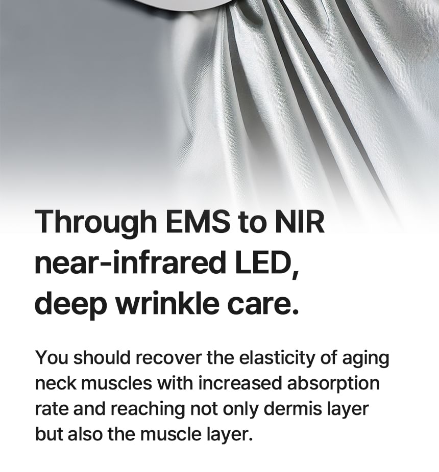 EMS and NIR Close-Range LED increase moisture levels and improve elasticity, effectively targeting sagging neck muscles.