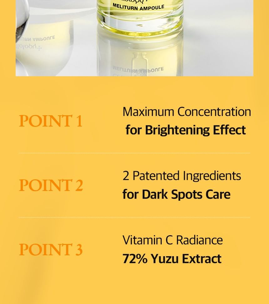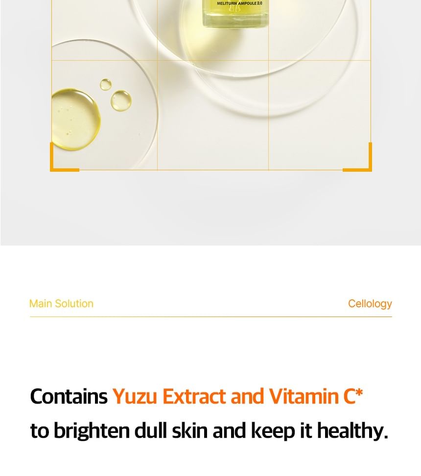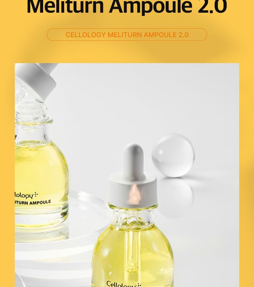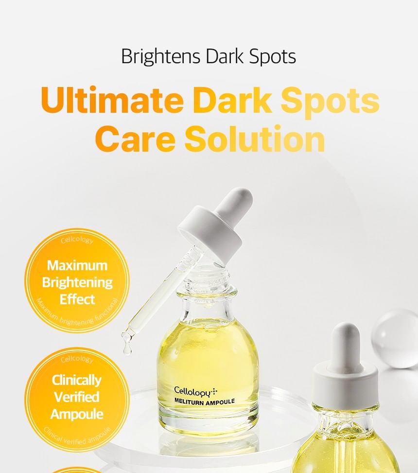 Cellology Meliturn Ampoule is a premium brightening and spot-correcting serum from the Korean tech-skincare brand Cellology. It's a highly concentrated ampoule designed for targeted care of dullness, hyperpigmentation, dark spots, freckles, acne scars/post-inflammatory marks, and uneven skin tone. Often positioned as a non-invasive, at-home "medical-grade" brightening solution, it's especially popular when paired with the brand's Meliturn Shot Gun device (which uses dual-wavelength LED + micro-stamping for deeper delivery — up to 3,500 shots per minute). Clinical claims and user buzz highlight visible brightening and spot fading in as little as 2 weeks, with KFDA-approved maximum niacinamide concentration for whitening efficacy. It's a bestseller in Olive Young and frequently called the "yuzu brightening ampoule" in K-beauty communities.