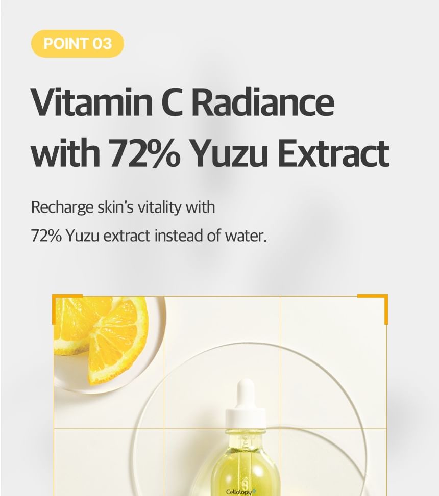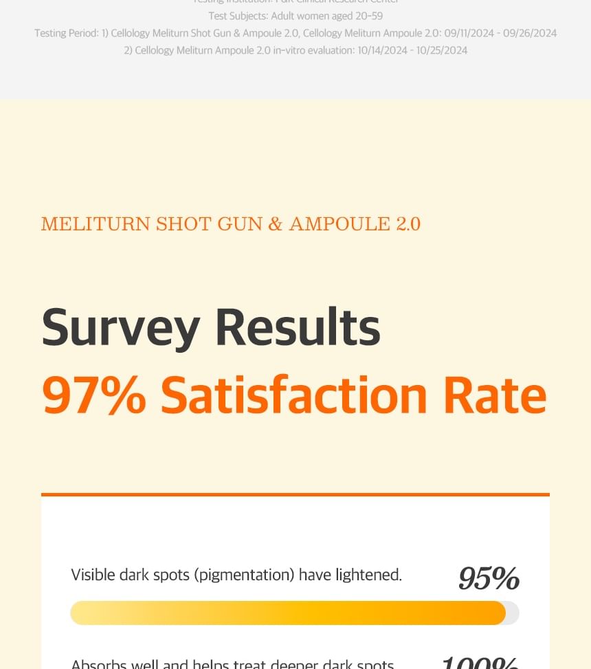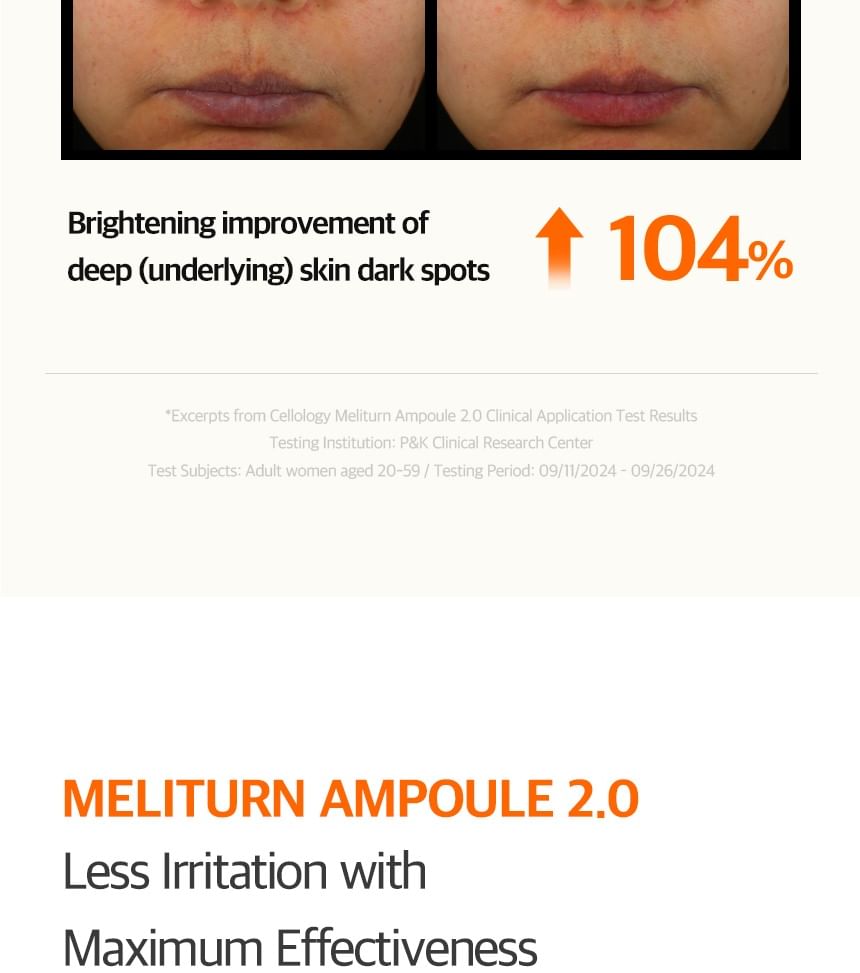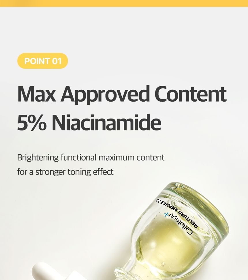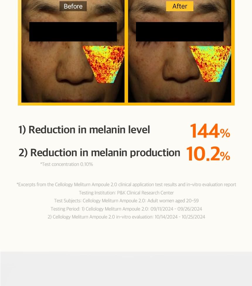 Cellology Meliturn Ampoule is a premium brightening and spot-correcting serum from the Korean tech-skincare brand Cellology. It's a highly concentrated ampoule designed for targeted care of dullness, hyperpigmentation, dark spots, freckles, acne scars/post-inflammatory marks, and uneven skin tone. Often positioned as a non-invasive, at-home "medical-grade" brightening solution, it's especially popular when paired with the brand's Meliturn Shot Gun device (which uses dual-wavelength LED + micro-stamping for deeper delivery — up to 3,500 shots per minute). Clinical claims and user buzz highlight visible brightening and spot fading in as little as 2 weeks, with KFDA-approved maximum niacinamide concentration for whitening efficacy. It's a bestseller in Olive Young and frequently called the "yuzu brightening ampoule" in K-beauty communities.