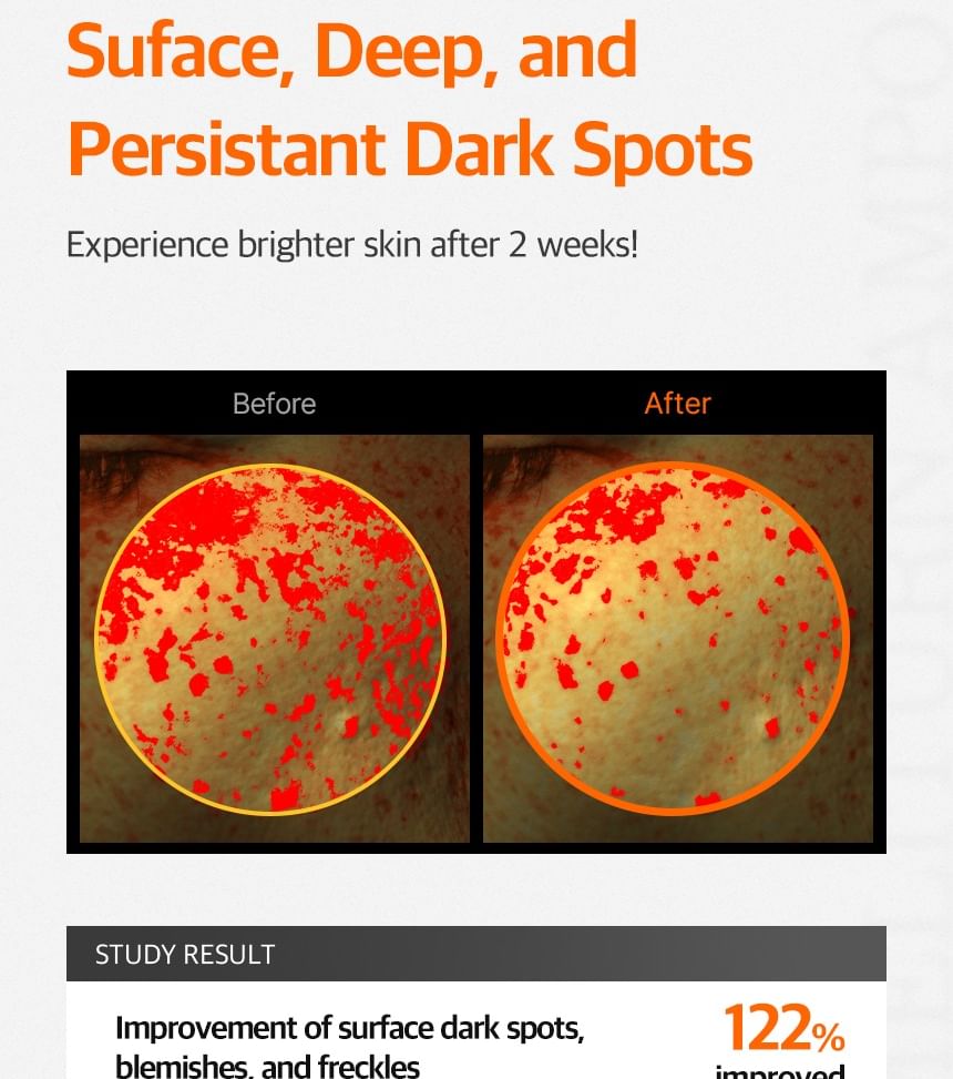 - Targets and fades dark spots, freckles, hyperpigmentation, and post-acne marks (effective on both surface and deeper layers).