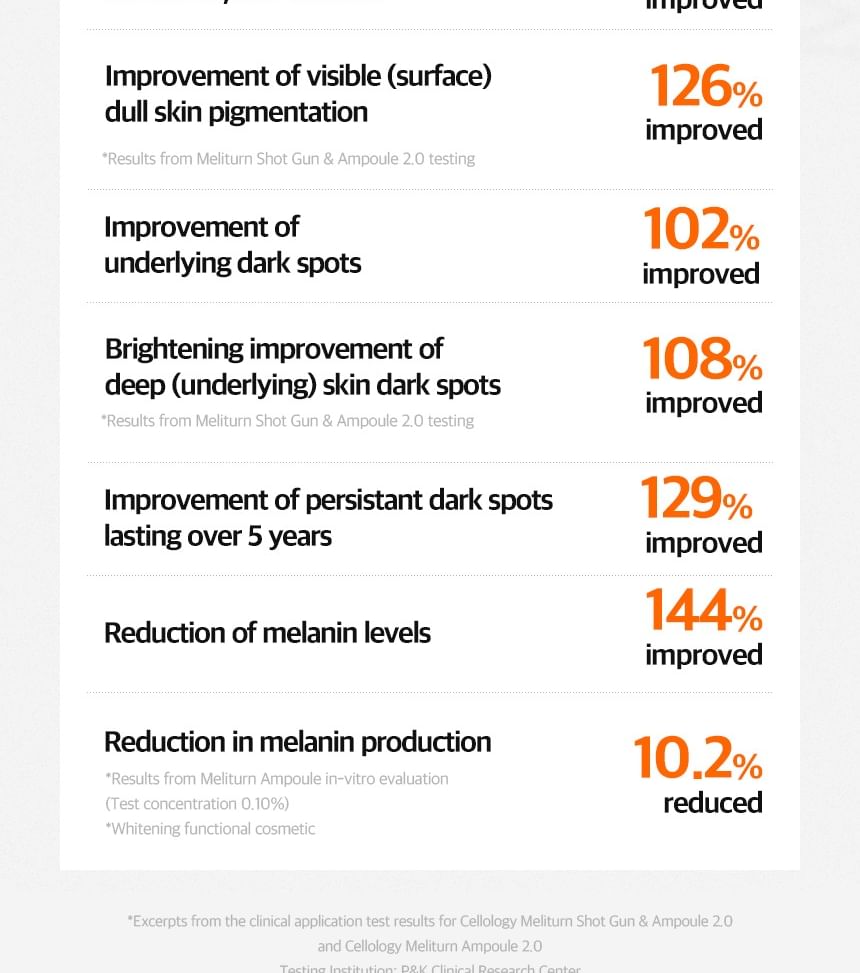 - Texture & Usage Experience: Lightweight, fast-absorbing watery-serum texture — non-sticky, no heavy residue, mild natural scent (no overpowering fragrance), low-irritation formula suitable for sensitive, combination, oily, and most skin types. Apply morning and/or evening after cleansing; use all over face or spot-treat pigmented areas. For amplified results, layer with the Meliturn Shot Gun (apply ampoule to device cartridge for micro-delivery).