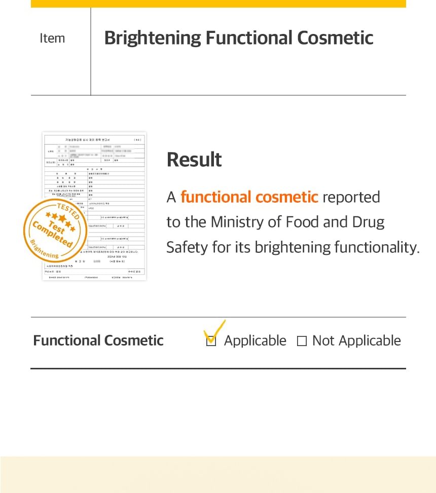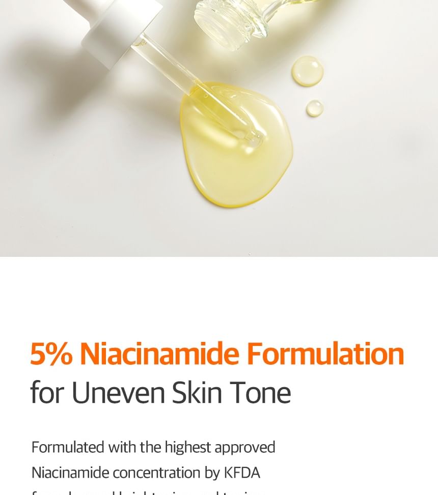 - 5% Niacinamide — Maximum KFDA-notified concentration for whitening/brightening; inhibits melanin production, fades dark spots and discoloration, evens tone, controls oil, strengthens skin barrier, and minimizes pores.