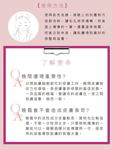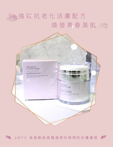 強化抗老化活膚配方 煥發青春美肌 sMTS青春動能晚霜適用於晚間的皮膚護理,在晚上敵動無輕修復機能,預防肌膚加速老化。