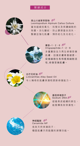 關鍵成份: 高山火絨草萃取物(Leontopodiiim Alpinum CaHus Culture) 富含超級抗氧化、抗發炎及保護細胞的物質。淡化皺紋、防止膠原蛋白流失、緊緻並強化肌膚、預防老化及光老化。