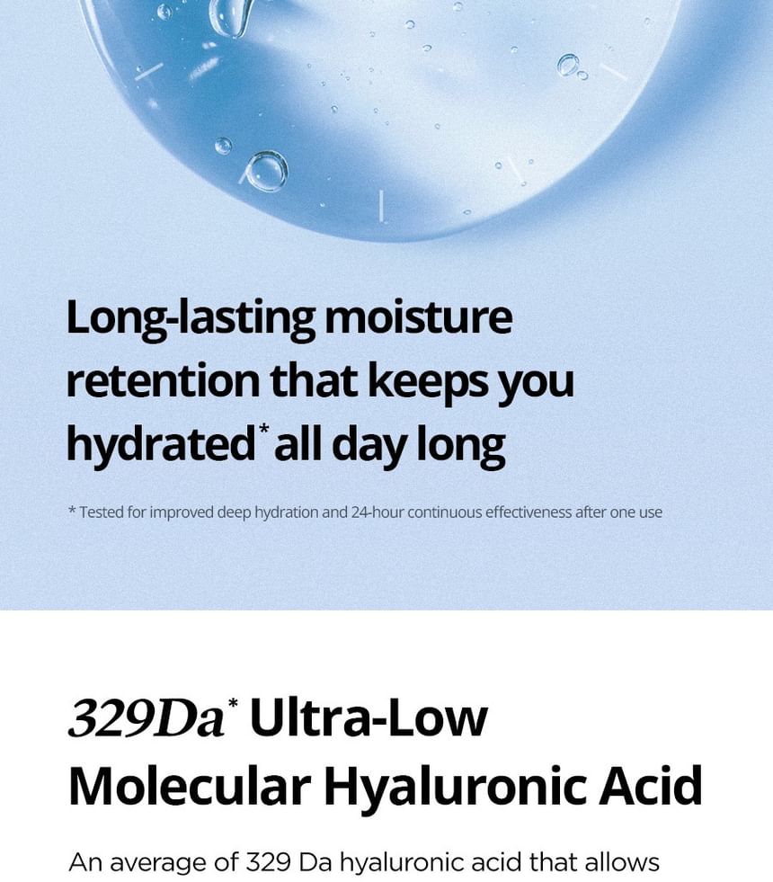 Formulated with 14 kinds of Hyaluronic Acid to retain moisture in skin for a long time.
