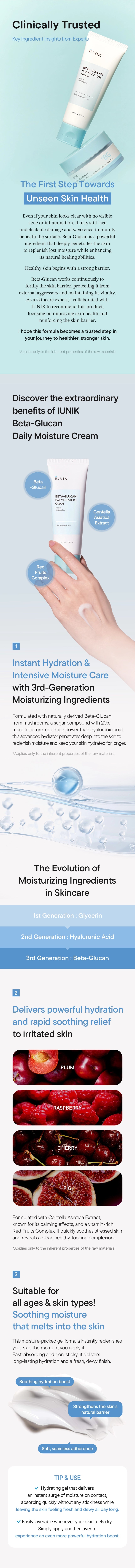 - Beta-Glucan It retains moisture 20% better than hyaluronic acid improves skin elasticity and recovery.