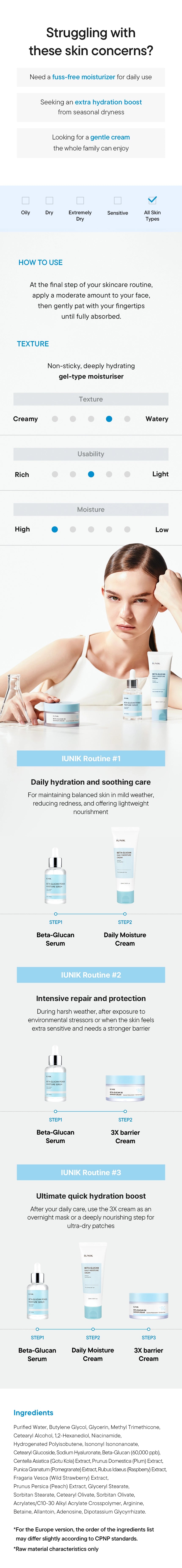 Water, Butylene Glycol, Glycerin, Methyl Trimethicone, Centella Asiatica Extract, Beta-Glucan, Cetearyl Alcohol, 1,2-Hexanediol, Niacinamide, Hydrogenated Polyisobutene, Isononyl Isononanoate, Cetearyl Glucoside, Glyceryl Stearate, Sorbitan Stearate, Cetearyl Olivate, Sorbitan Olivate, Acrylates/C10-30 Alkyl Acrylate Crosspolymer, Betaine, Allantoin, Adenosine, Dipotassium Glycyrrhizate, Glucose, Sodium Hyaluronate, Arginine, Prunus Salicina Fruit Extract, Punica Granatum Fruit Extract, Rubus Idaeus (Raspberry) Fruit Extract, Fragaria Vesca (Strawberry) Fruit Extract, Prunus Persica (Peach) Fruit Extract