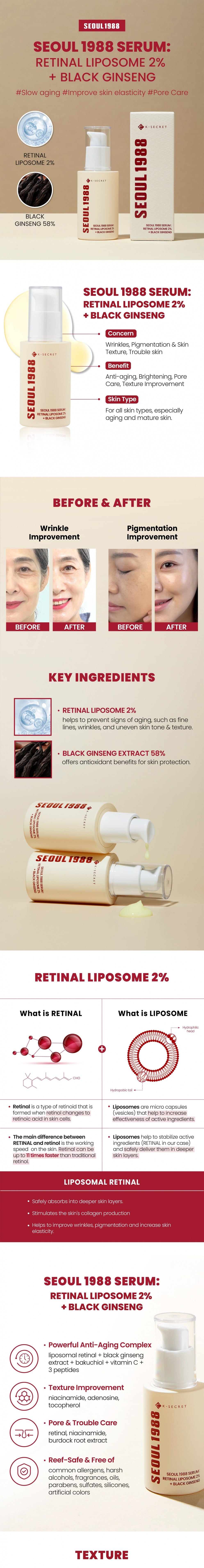 An anti-aging serum enriched with 2% Rentinal liposome and Black ginseng to promote a youthful, radiant complexion, while addressing skin texture, hydration, and the reduction of wrinkles.