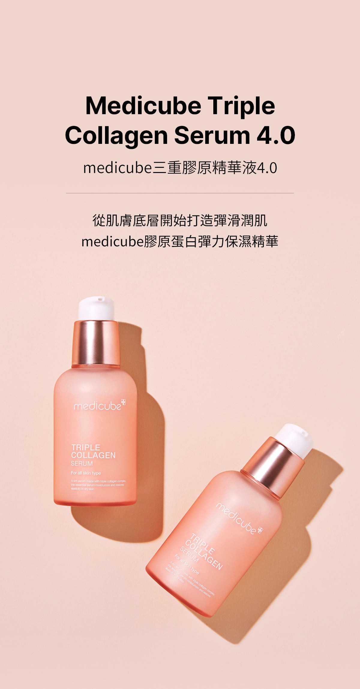使用三重膠原蛋白複合物配製的三重膠原蛋白精華 3.0 滋養暗沉肌膚,呈現令人羨慕的玻璃光澤。