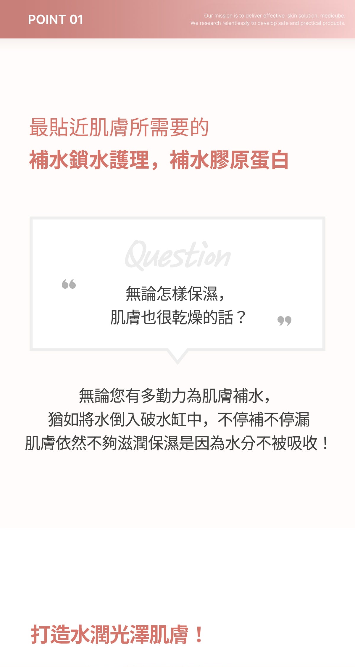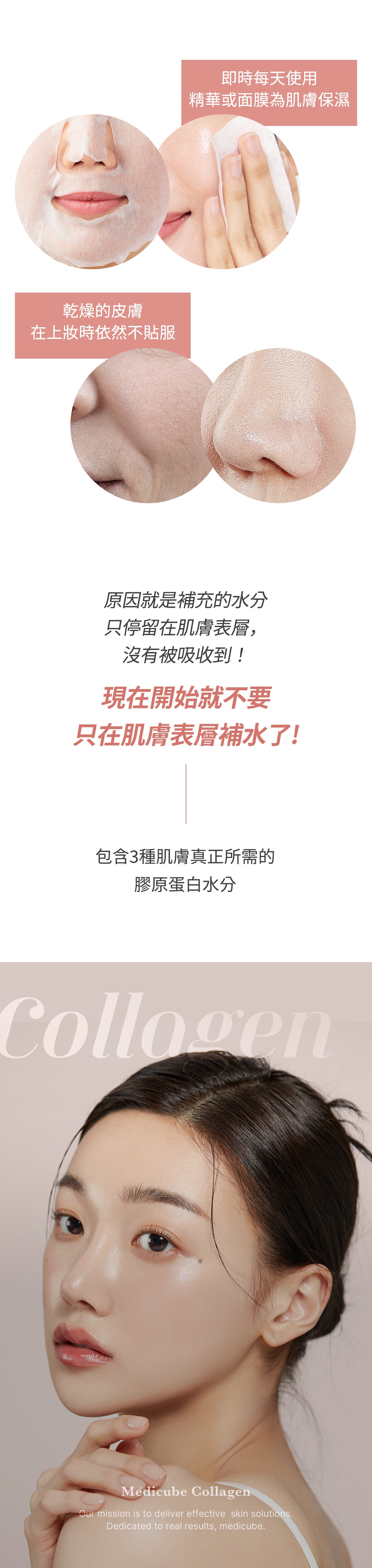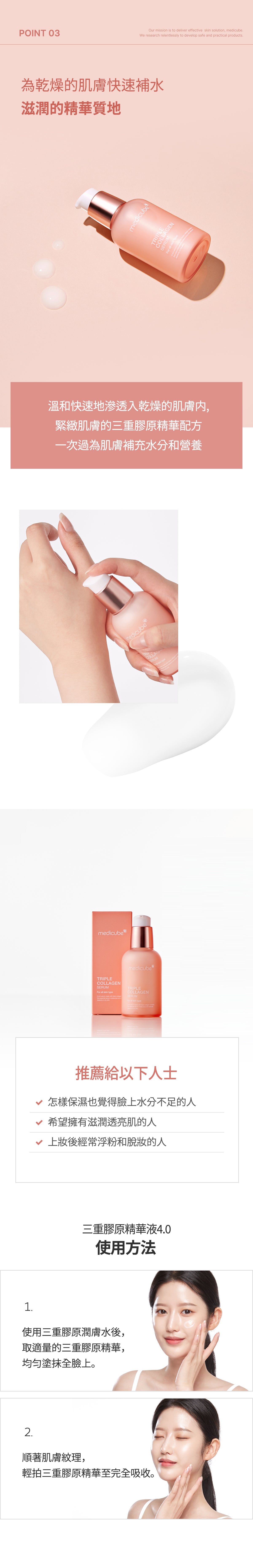 1. 潔面及爽膚後,取適量三重膠原蛋白精華3.0塗抹於整個臉部
