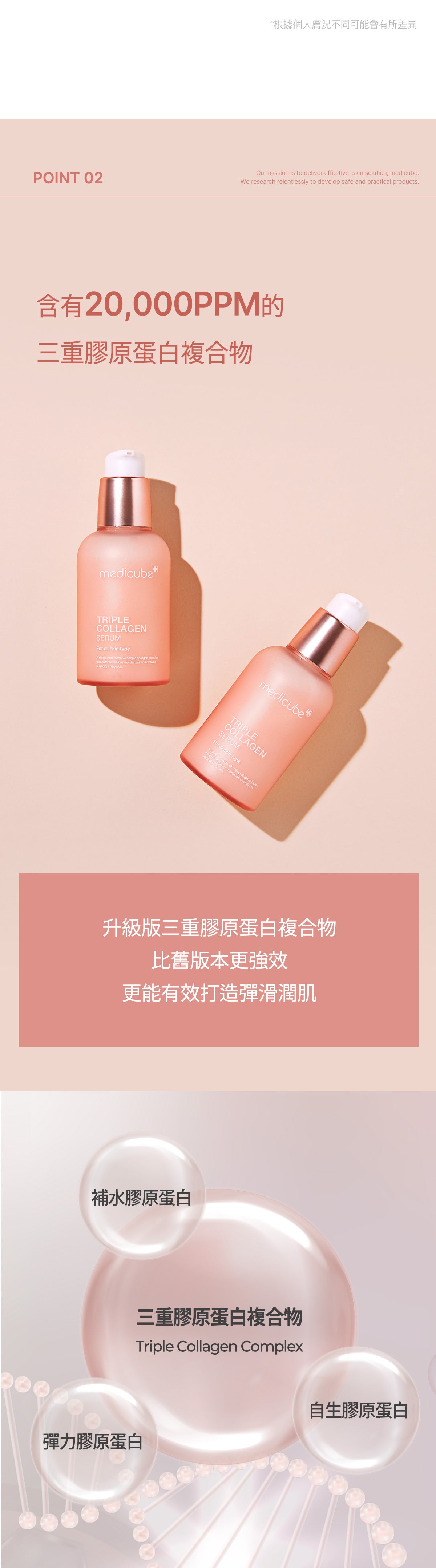 三重膠原蛋白精華 3.0 是一款輕質精華,含有 20,000ppm 的強化膠原蛋白。水解膠原蛋白、atelo 膠原蛋白和可溶性膠原蛋白構成了三重膠原蛋白複合物,能夠更快、更深入地滲透到皮膚屏障中,為最深層的皮膚層提供所需的營養,使皮膚看起來豐滿健康。