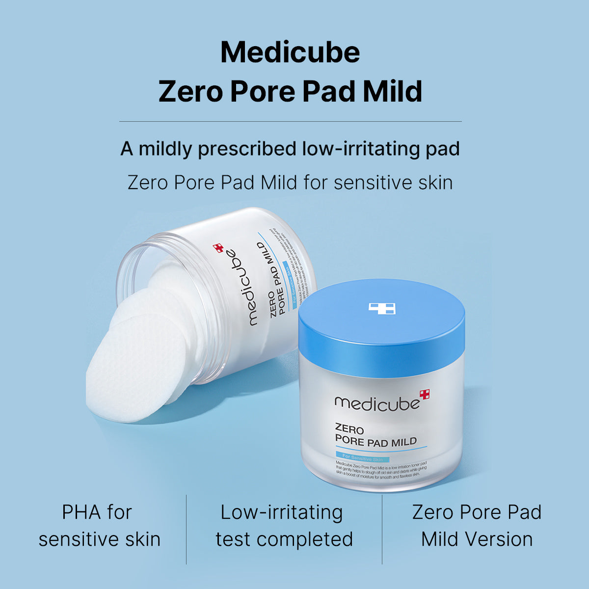 The Zero Pore Pad Mild features PHA which are great ingredients for exfoliation and smaller pores! Now, no matter how ultra-sensitive your skin is, you can have clearer pores too! Medicube has made a lighter, gentler formula of our patented Pore Tightening Complex to make sure your delicate skin stays soothed and moisturized while the dual-textured toner pads exfoliate dead skin cells, regulate sebum, and tighten pores. For skin that's beyond sensitive, take the extra precaution by choosing the Zero Pore Pad MILD.