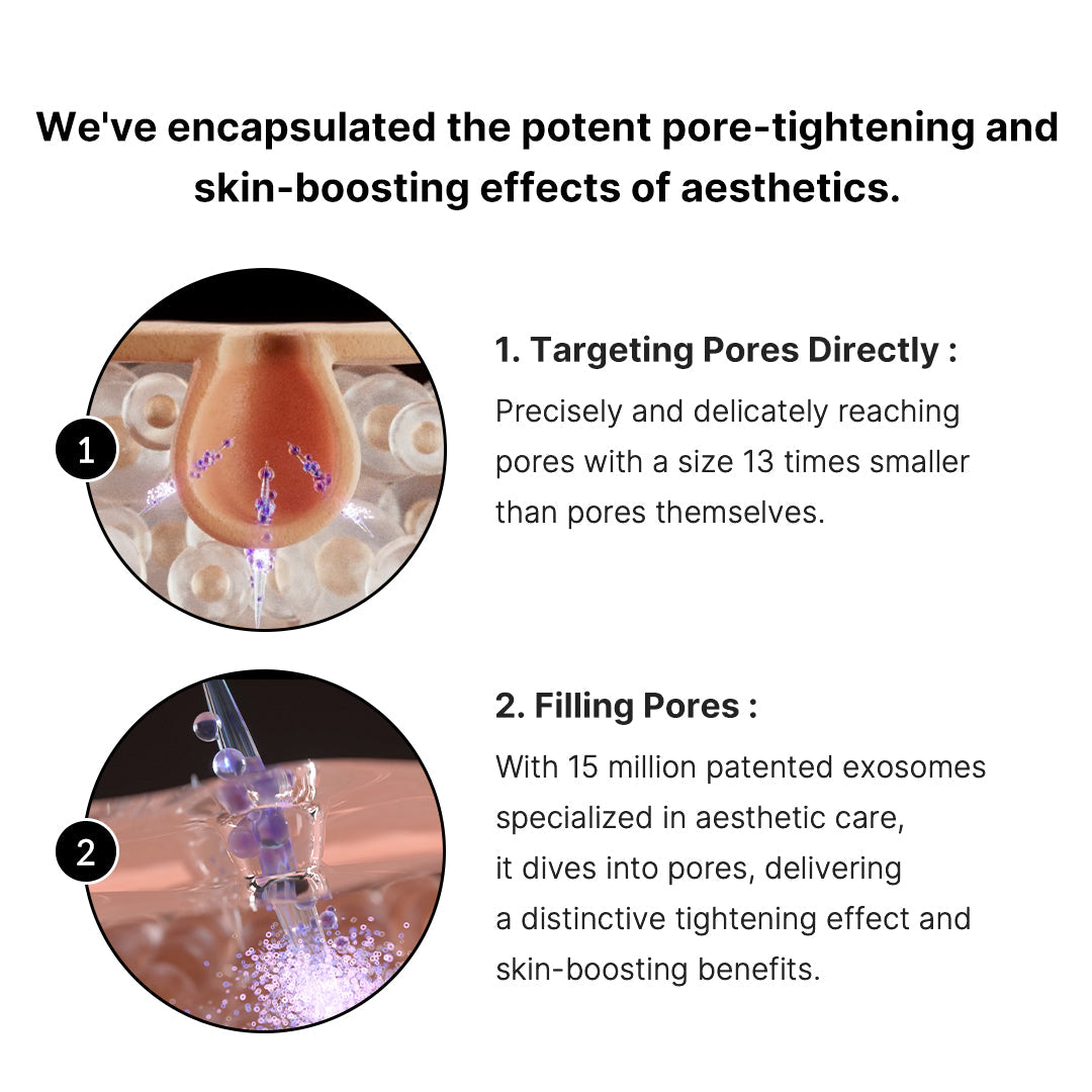 Contains the powerful pore-tightening effect of aesthetics! : Reaches pores precisely and delicately with a size of 16µm, which is 13 times smaller than pores. 15 million patented exosomes with 100% purity of aesthetic professional care ingredients are inserted into pores to deliver a differentiated tightening effect.