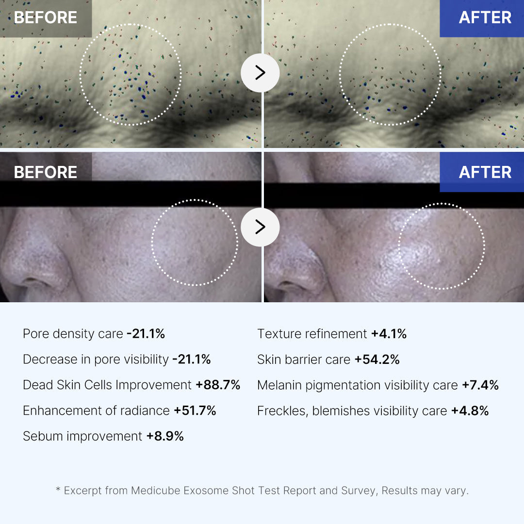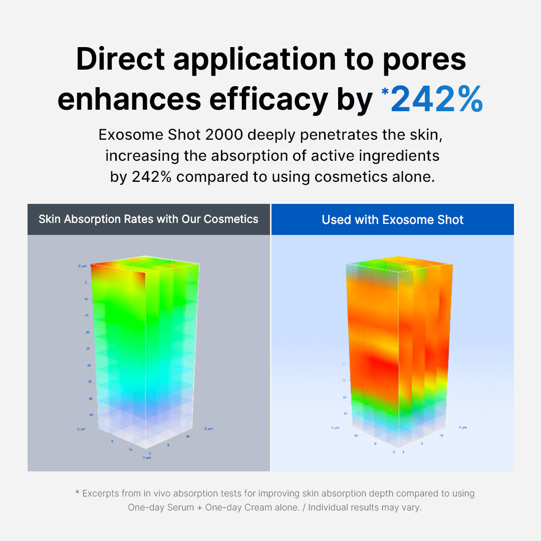 - When used in conjunction with the Exosome Shot, the One-day Serum and One-day Cream result in an 88% improvement in pore volume and an 85% improvement in pore area compared to using the Exosome Shot alone. be For more effective pore management, we recommend using the Exosome Shot Ampoule first, followed by the One-day Serum, and finishing with the One-day Cream.