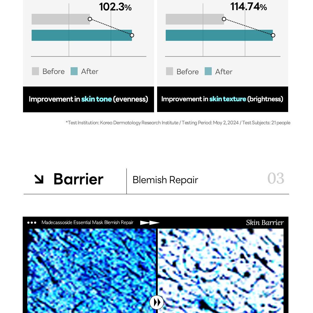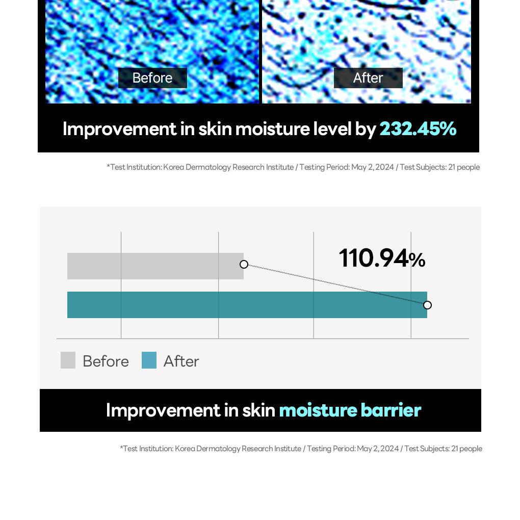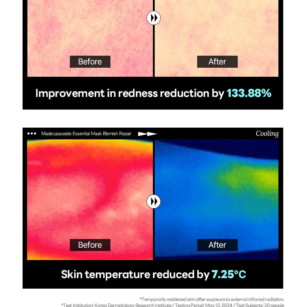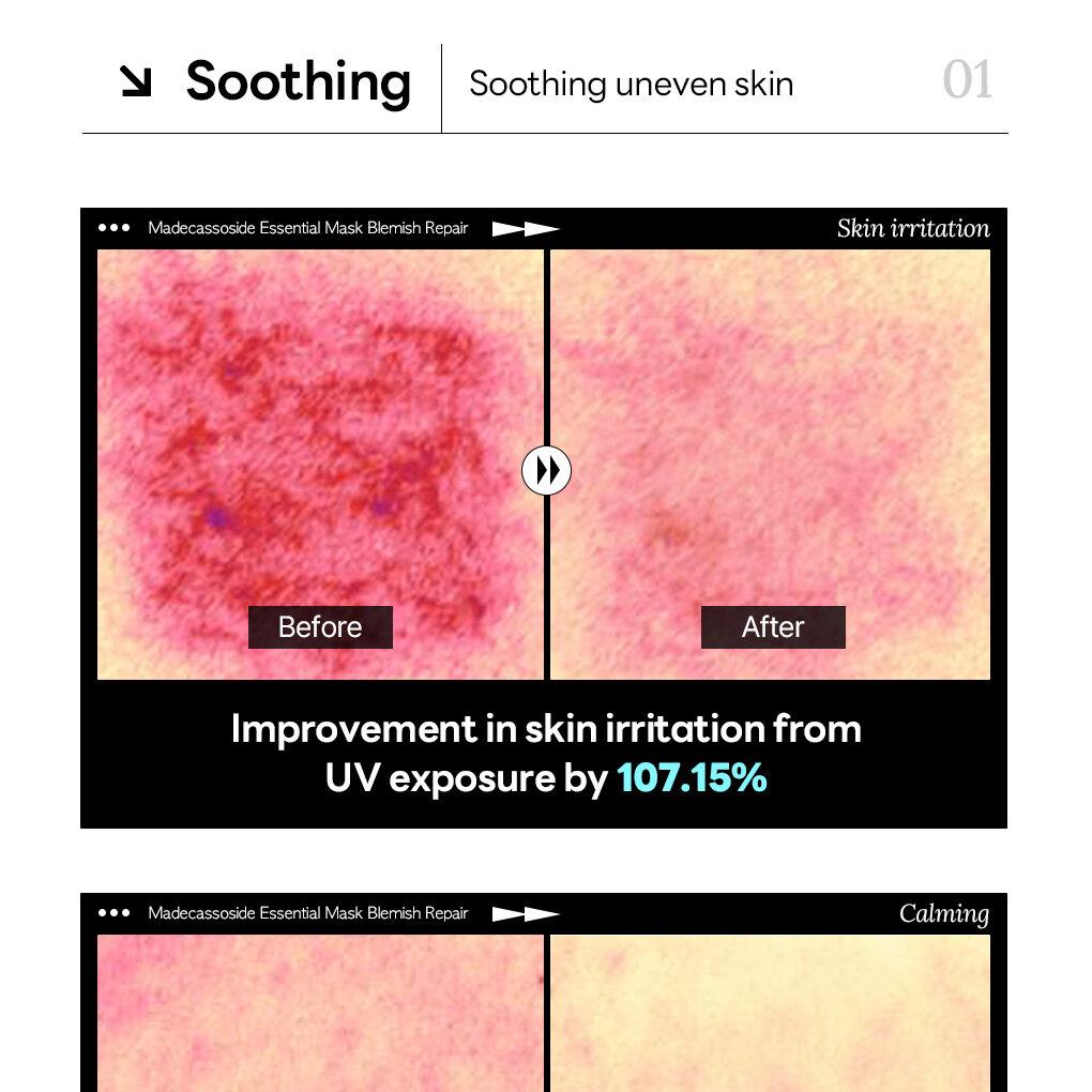Provides soothing of red skin, reduces skin temperature, improves melanin area, skin tone, skin moisture content, moisture barrier, and skin texture.