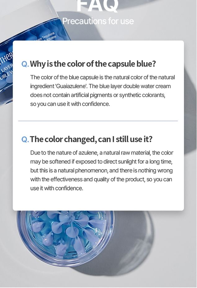 Formulated with Guaiazulene ingredient locked inside the blue capsules to provide skin soothing benefits, and Agave Tequilana Leaf Extract infused in the gel cream to moisturize and suppress transepidermal water loss.