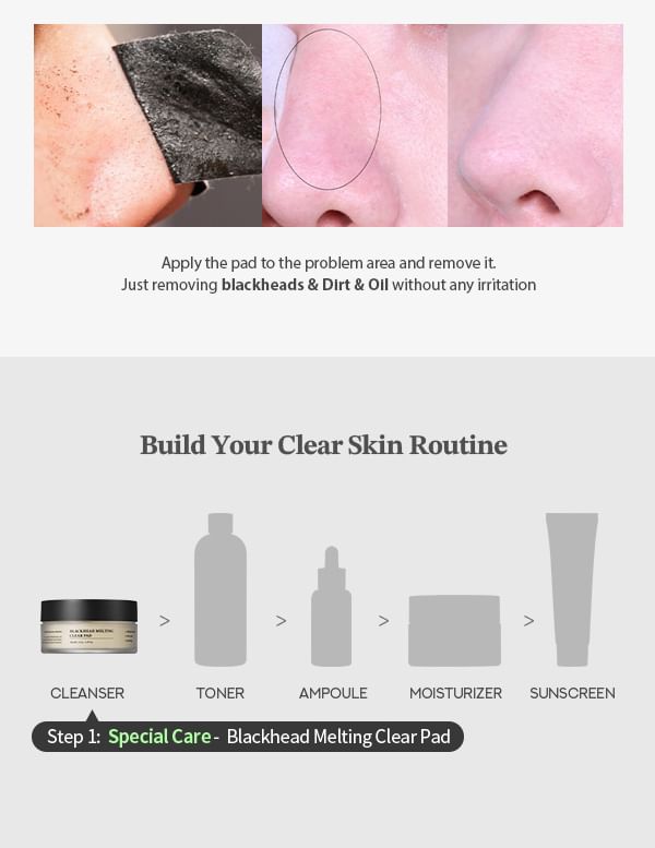 Melt blackheads and unclog pores with this Blackhead Melting Clear Pad. It’s drenched in Sebum Melting Complex (made of witch hazel water, sage leaf extract and more) to remove excess sebum and impurities for clear skin and pores. It’s also formulated with allantoin and sodium hyaluronate to restore moisture in skin.
