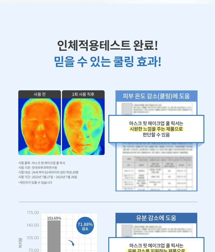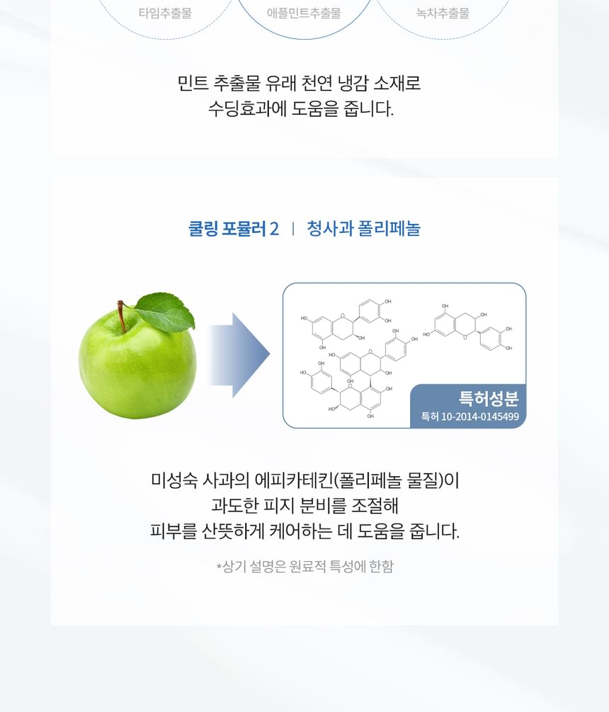 Cooling formula including Thymus Vulgaris (Thyme) Extract, Mentha Suaveolens Leaf Extract and Camellia Sinensis Leaf Extract cool down the skin temperature and help with the moisture effect.