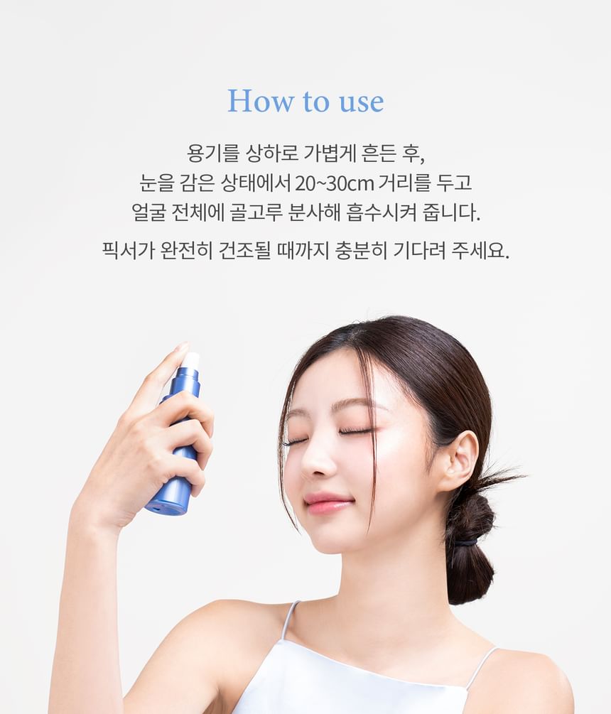 Shake well before use, spritz mist over the entire face from the 20~30cm from the face, and wait till it is completely dry.