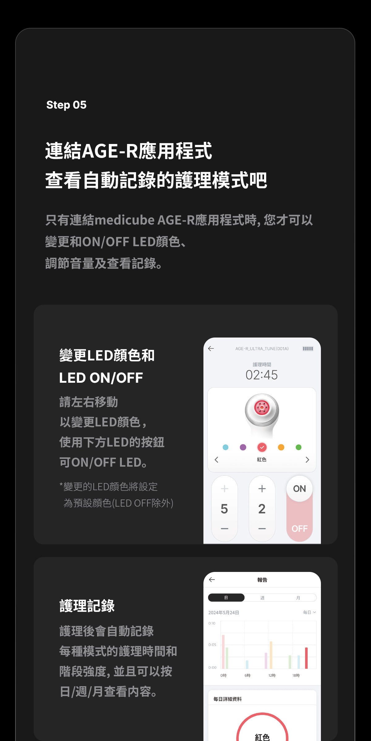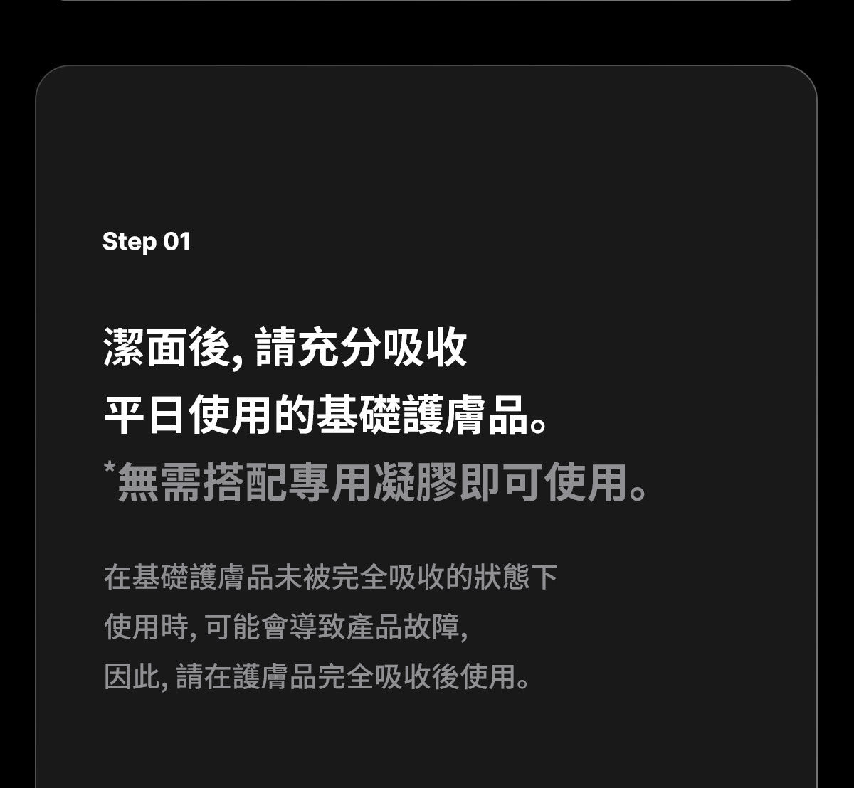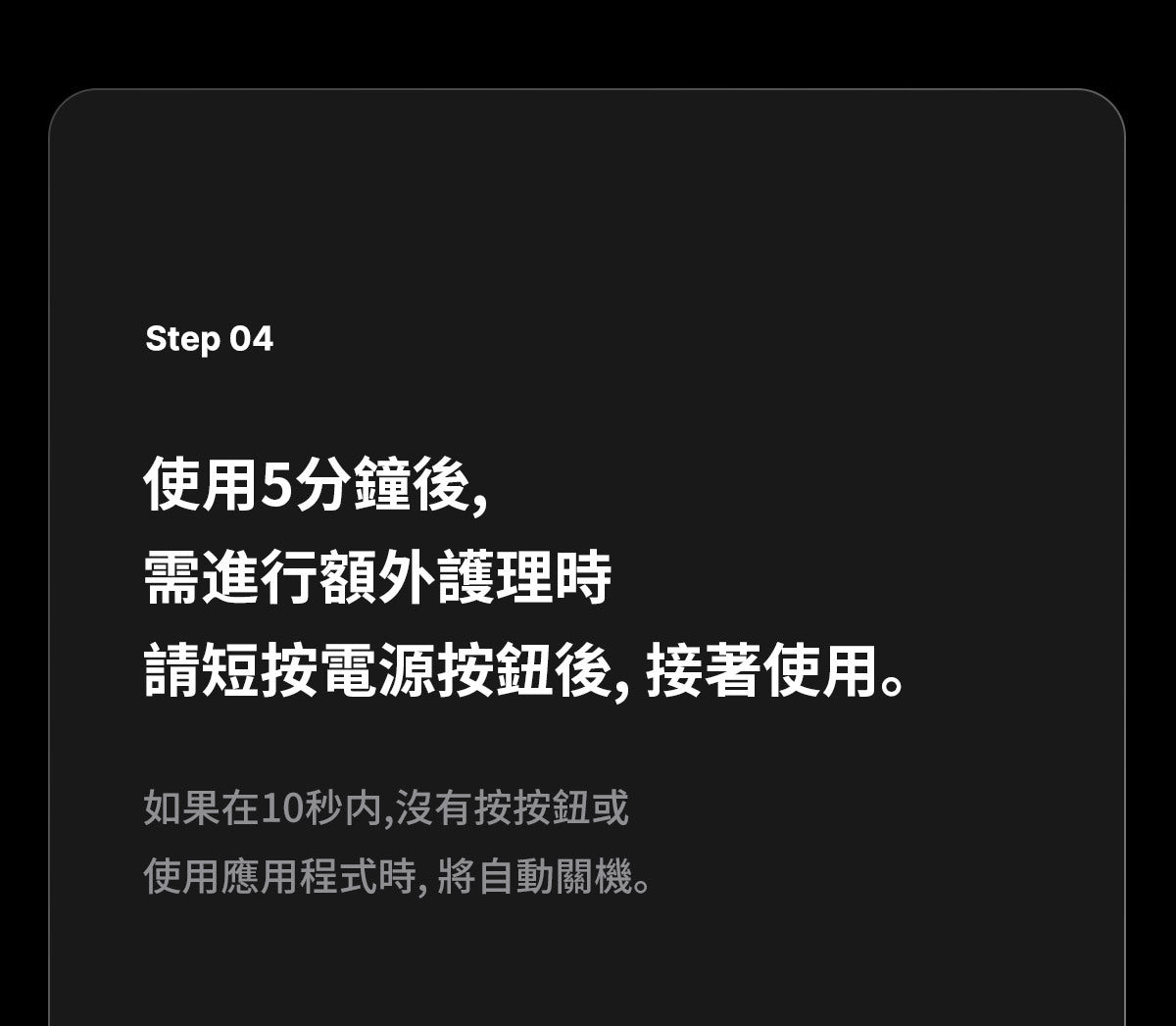 🔹Step 04 使用5分鐘後如需追加護理,請短按電源按鈕繼續使用。 如果沒有特別的應用程序/按鈕操作,10秒內自動關閉。