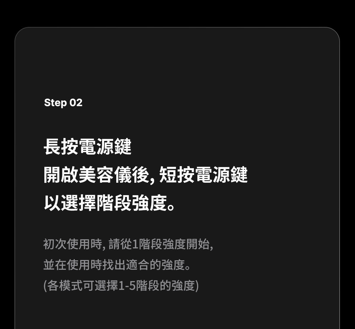 🔹Step 02長按電源按鈕打開電源後,短按電源按鈕選擇等級。 第一次使用時請務必從第1階段開始,使用時請找出適當的階段。(每種模式可使用1~5階段)