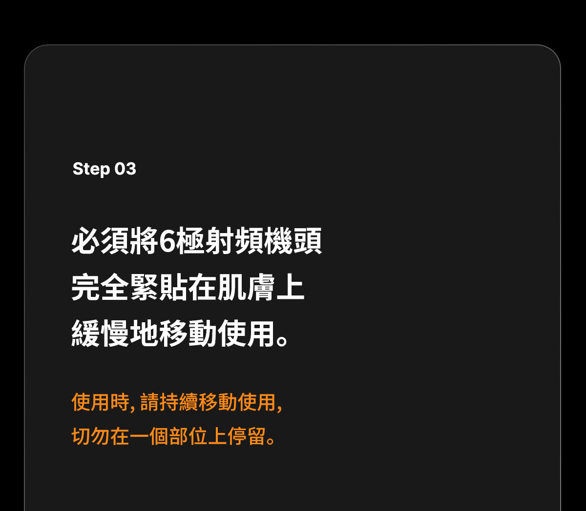 🔹Step 03 必須使用6個高頻頭在完全貼合肌膚的狀態下慢慢移動。 使用過程中絕對不要停留一個部位,請持續移動使用。