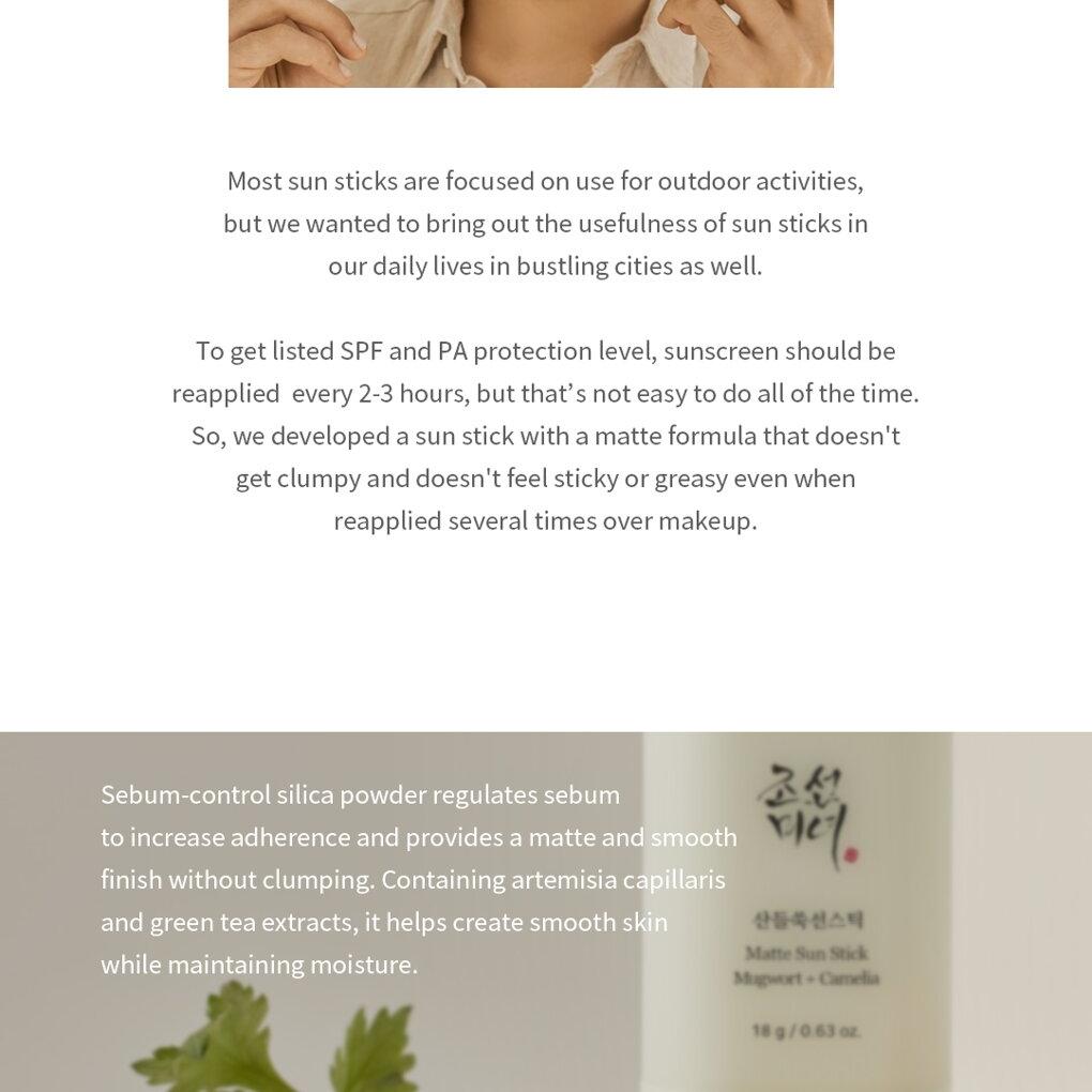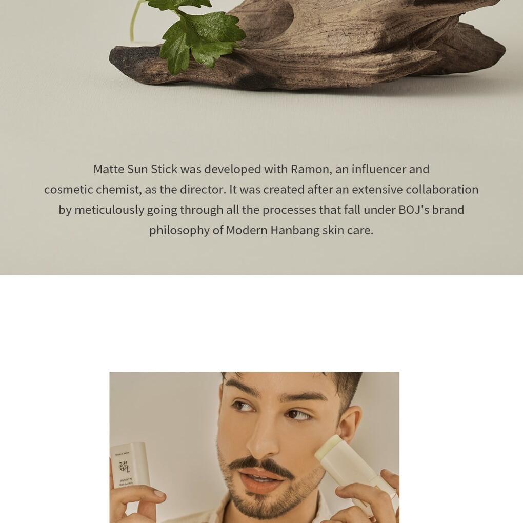 Matte Sun Stick 啞光防曬棒是由具有影響力的化妝品化學家 Ramón @glowbyramon 擔任總監開發。它於廣泛合作下經過精心打造而誕生,符合 Beauty of Joseon 現代韓方護膚的品牌理念。