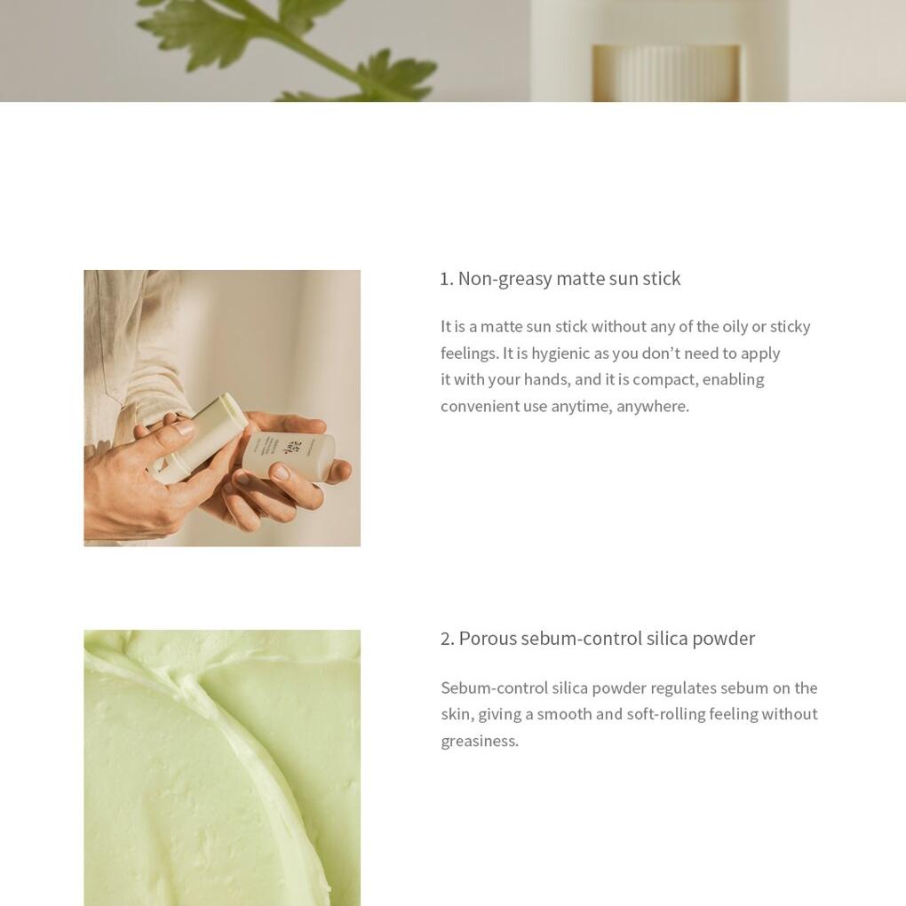 Matte Sun Stick 防曬棒採用可控制皮脂的二氧化矽粉末來調節油脂產生,並增強防曬成分的附著力,同時確保肌膚感覺啞緻。此外,它還富含艾草及綠茶萃取,有助保持肌膚水分及令肌膚柔滑。