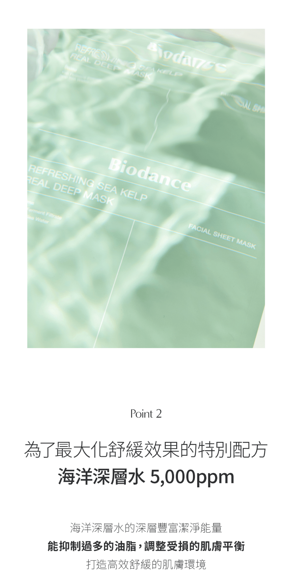 含有豐富礦物質的深層海水,可控制多餘皮脂,恢復肌膚平衡,發揮舒緩效果
