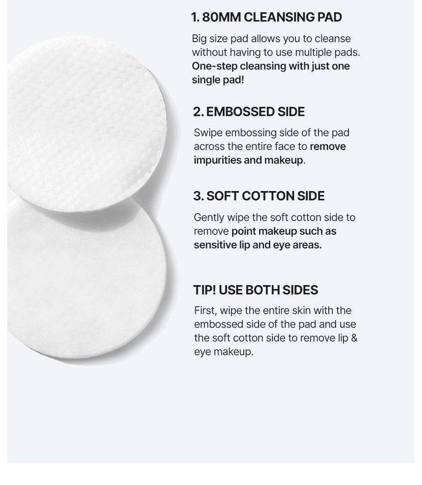 化妝棉尺寸為 80 毫米,帶有壓紋紋理,可徹底清潔肌膚