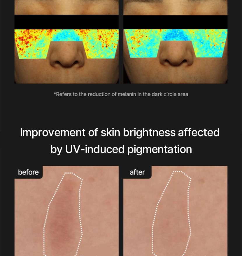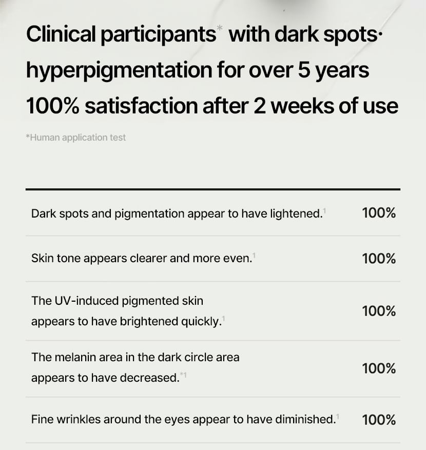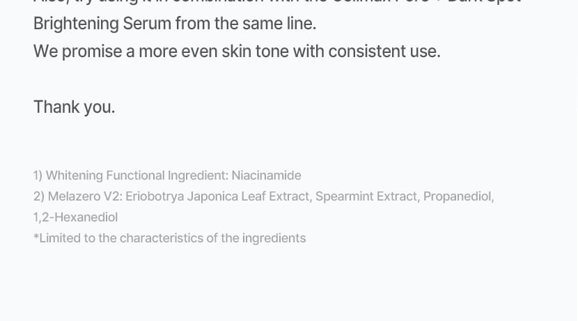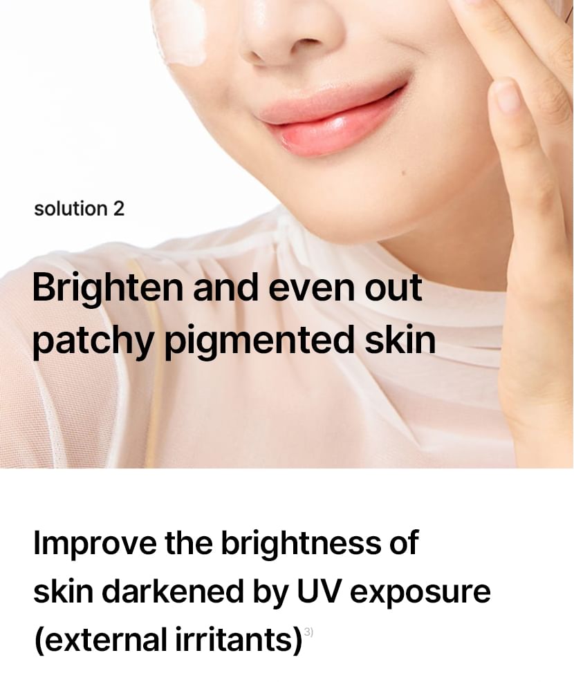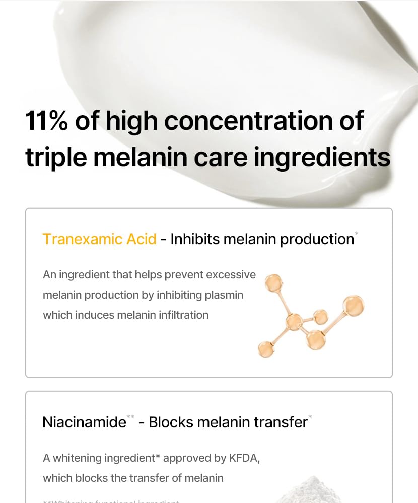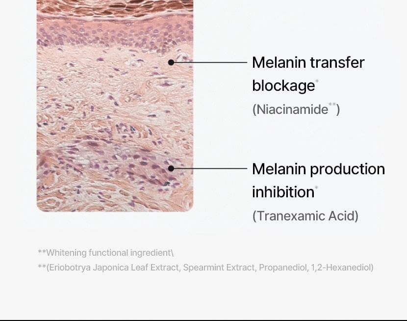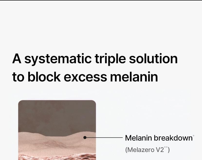 蘊含傳明酸、菸鹼醯胺和 Melazero V2 等成分,有助於抑制過量黑色素的生成,進而防止黑斑的出現。
