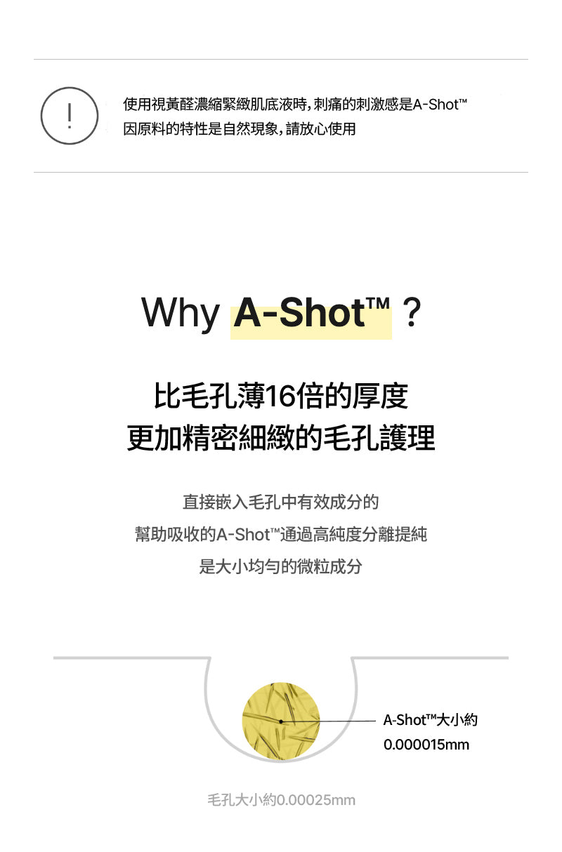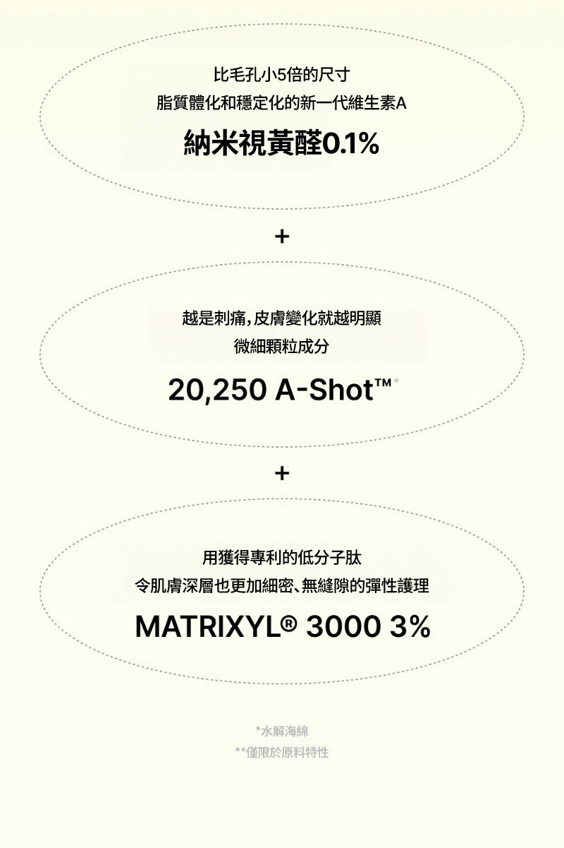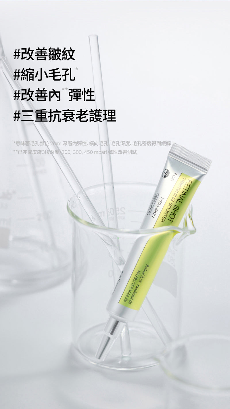 - 注入了 0.1% 視黃醇的先進形式的視黃醇,結合 A-Shot,旨在直接滲透毛孔並增強吸收能力,將視網膜深層滲透到皮膚中,以針對皺紋和毛孔擴大,促進皮膚光滑緊緻。