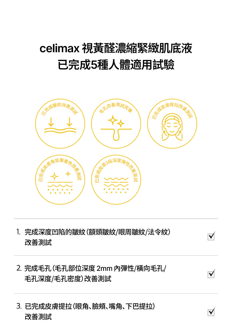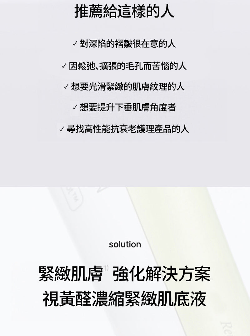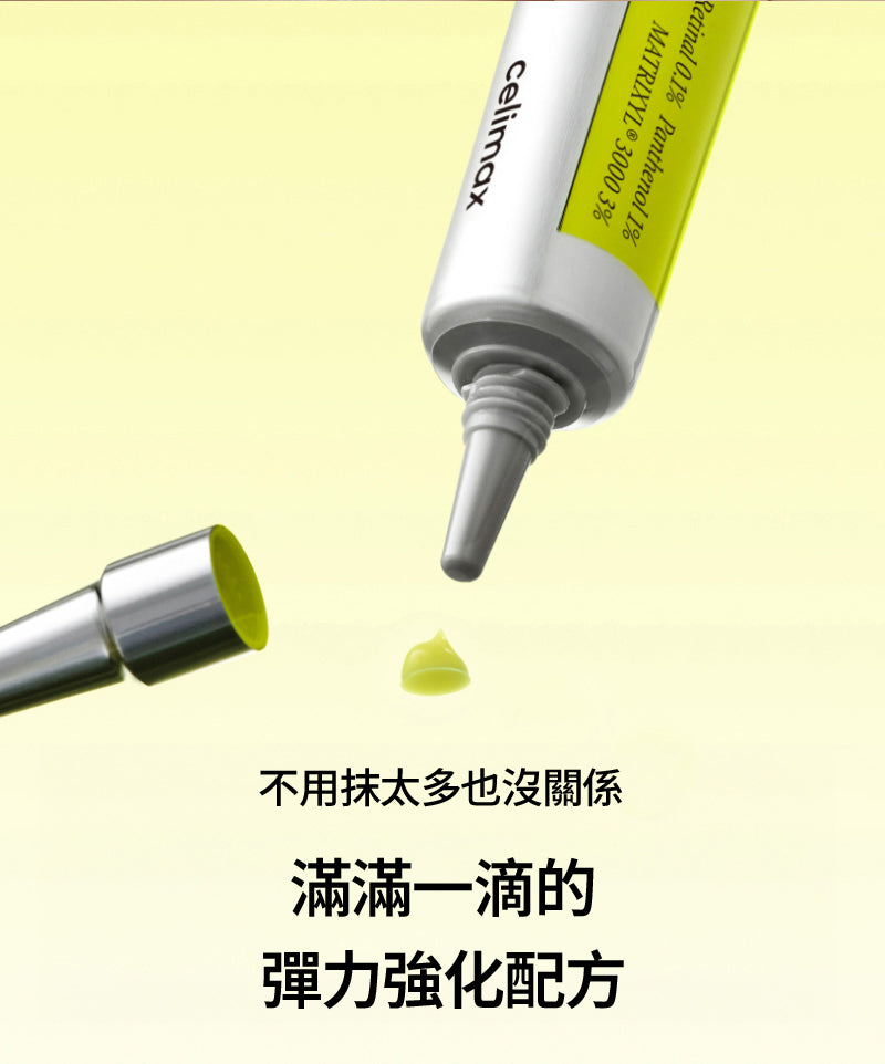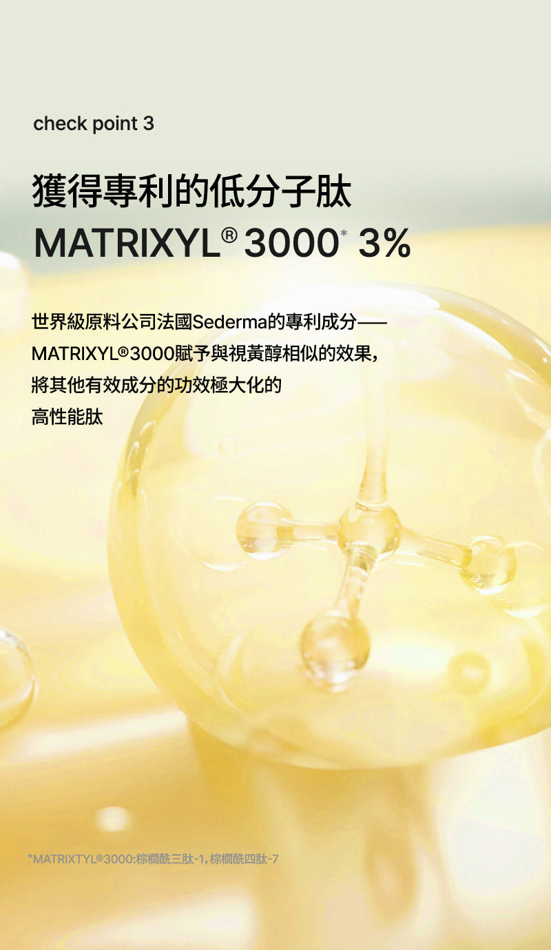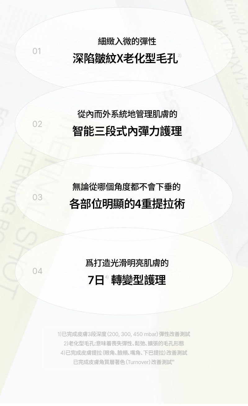 - 注入高濃度的視網膜,比視黃醇更高級的形式和 MATRIXYL,只需一滴即可為皺紋或毛孔粗大等困擾區域提供深層彈性。