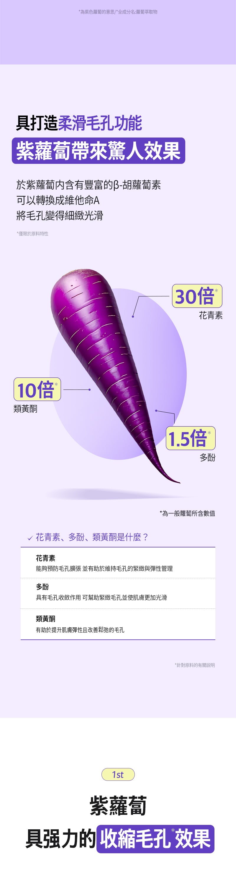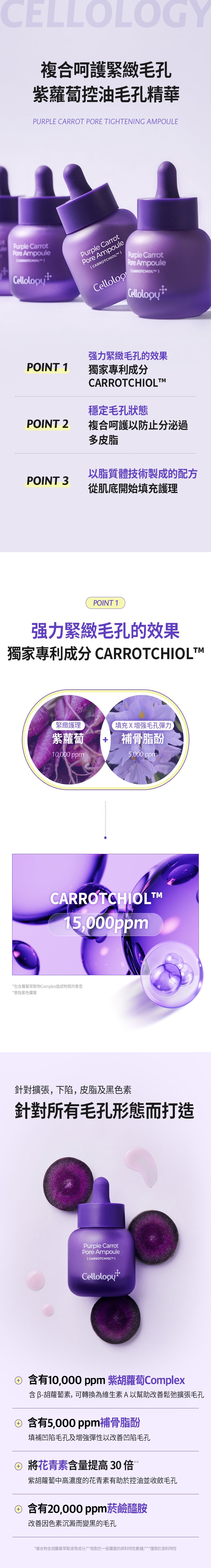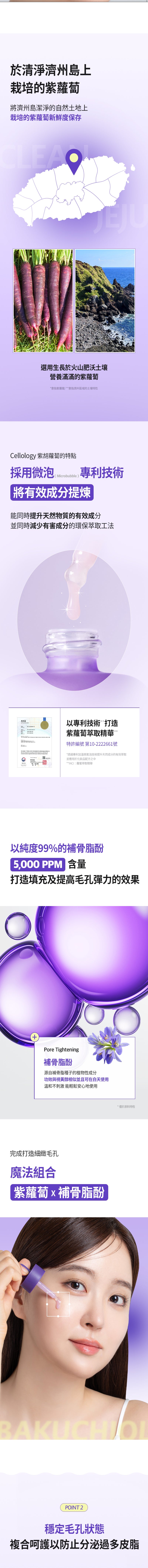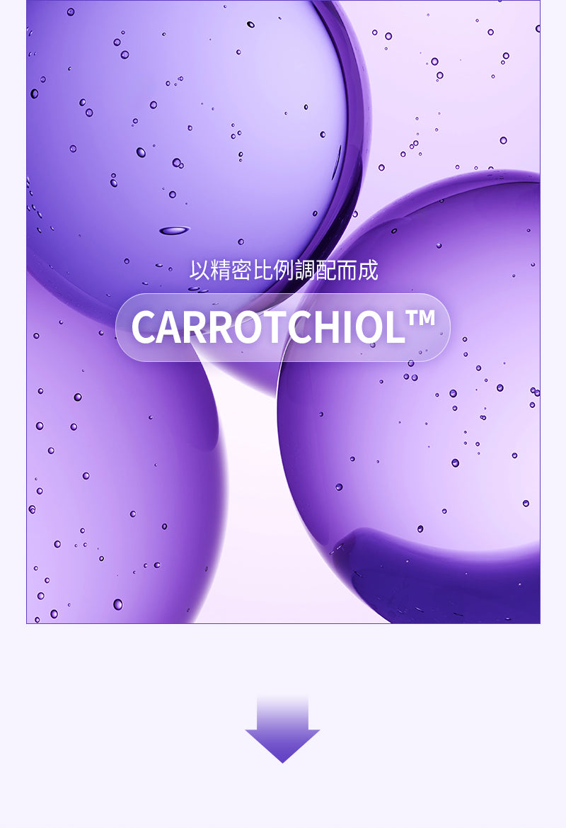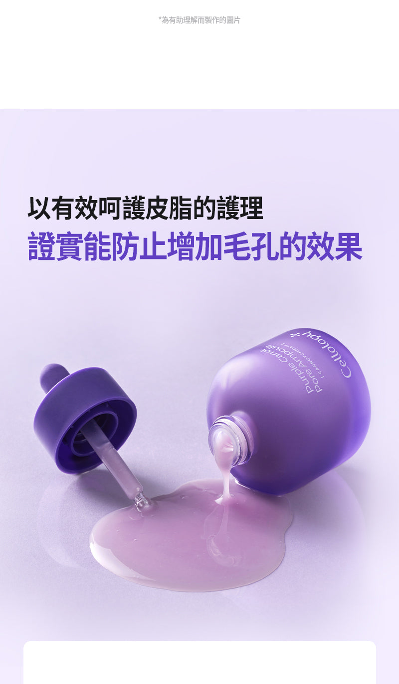 - 核心專利成分:Carotchiol™(韓國獨家專利),濃縮約800根濟州島紫蘿蔔(紫色胡蘿蔔)萃取 + 補骨脂酚(Bakuchiol),紫蘿蔔的有效成分(如花青素、多酚、胡蘿蔔素)比普通胡蘿蔔高出40倍以上,強效抗氧化、控油、填充毛孔並增加彈性。