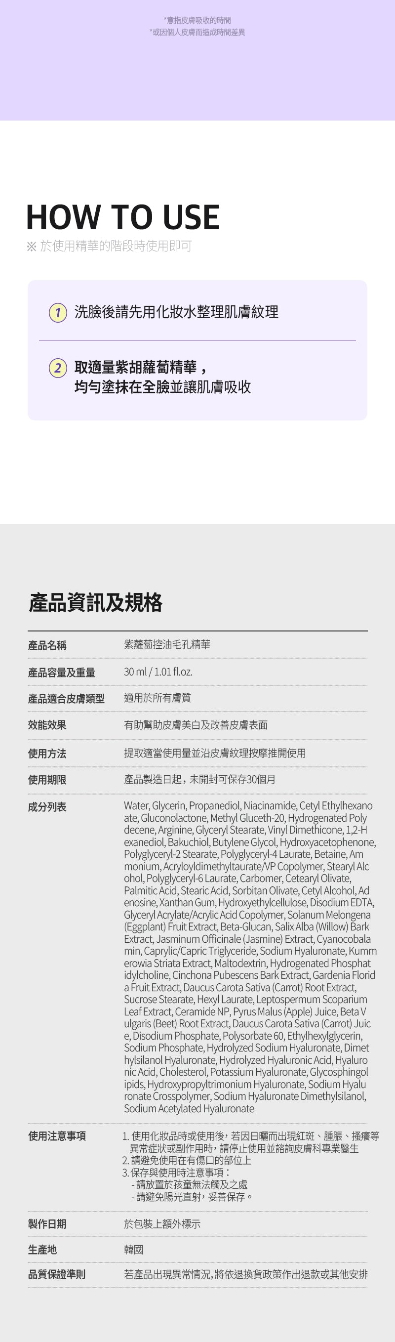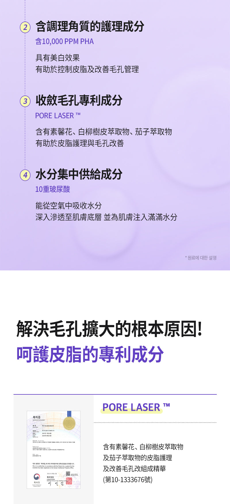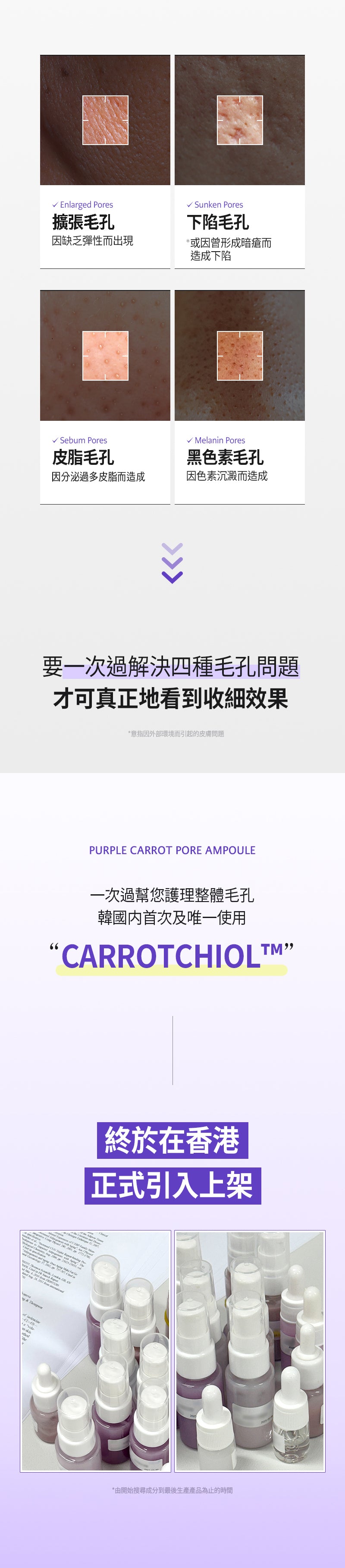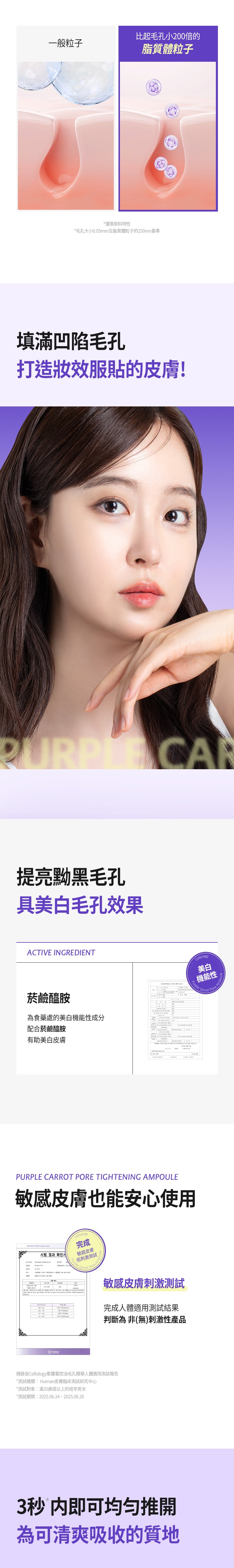 - 核心專利成分:Carotchiol™(韓國獨家專利),濃縮約800根濟州島紫蘿蔔(紫色胡蘿蔔)萃取 + 補骨脂酚(Bakuchiol),紫蘿蔔的有效成分(如花青素、多酚、胡蘿蔔素)比普通胡蘿蔔高出40倍以上,強效抗氧化、控油、填充毛孔並增加彈性。