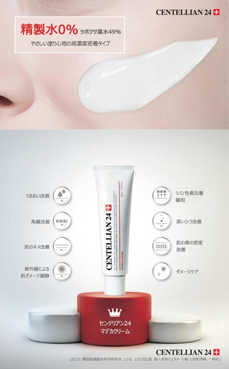 Madeca乳霜中的積雪草萃取(TECA)能夠穩定肌膚,促進肌膚再生,增強肌膚屏障功能,使肌膚不易受到刺激。它還能改善肌膚水分、角蛋白含量、膚質,舒緩紫外線造成的肌膚損傷,淡化色斑和色素沉著,改善深層皺紋,提升肌膚深層密度,並提供肌膚損傷修復。