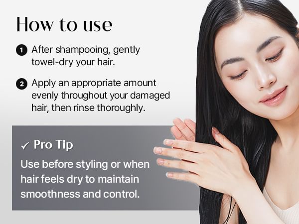洗髮後,輕輕擠去頭髮多餘水分,將護髮療程塗抹於髮中至髮尾。用溫水徹底沖洗乾淨。每週使用兩次以獲得最佳效果,建議搭配COSRX PEPTIDE-132 鍵結護髮三部曲(洗髮精、護髮療程、精華油)使用,以增強修護效果。