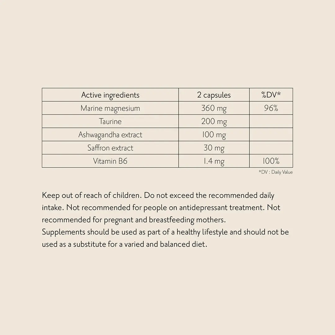 Magnesium oxide - Soluble acacia fiber - Taurine - Capsule shell : hypromellose - Dry extract of ashwagandha root KSM 66 (withania somnifera l.) - Dry extract of saffron stigma (crocus sativus l.) - Pyridoxine hydrochloride (vitamin B6)