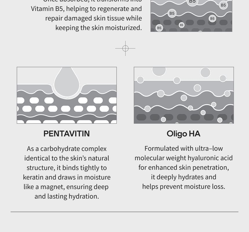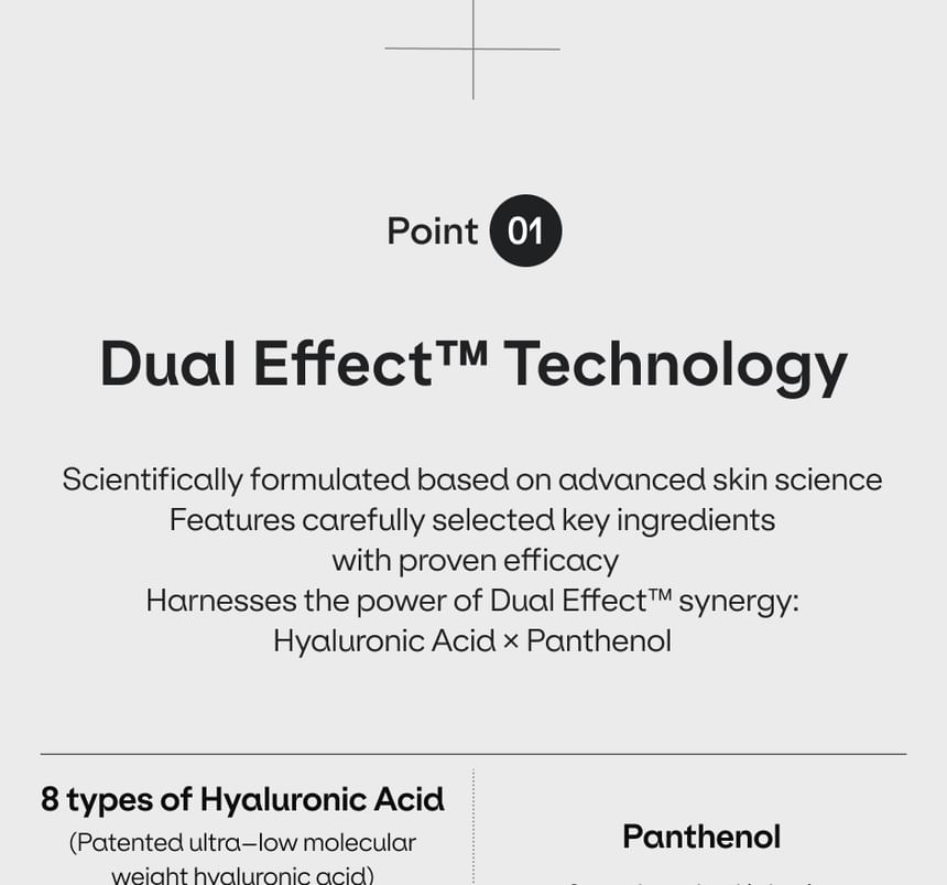 深層補水:蘊含 8種類型的透明質酸 (Hyaluronic Acid) 和 泛醇 (Panthenol),能為乾燥肌膚提供豐富的水分和滋養。
