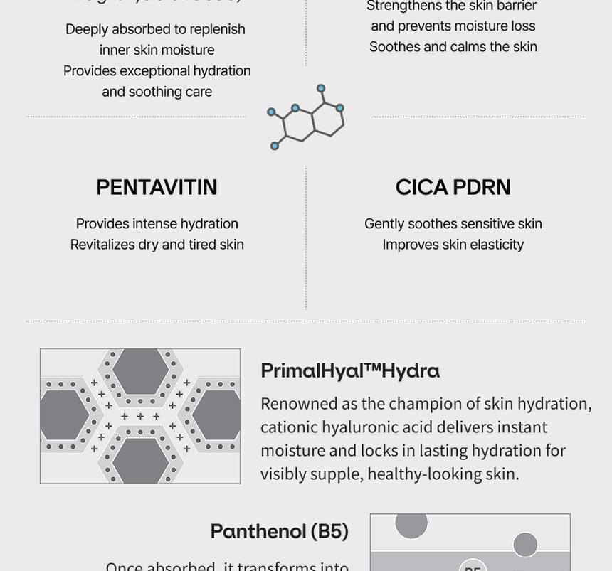 舒緩活膚:含有 Pentavitin 和 CICA PDRN 成分,有助於活化疲憊肌膚,並為敏感肌膚提供鎮靜護理,同時提升肌膚彈性。