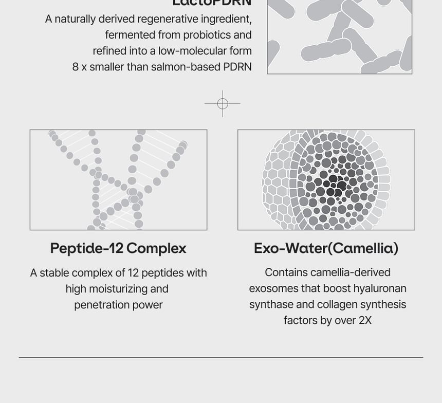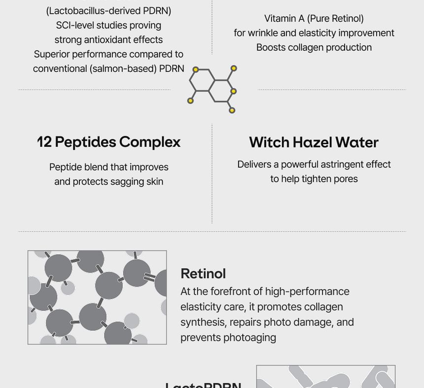 PDRN (聚脫氧核苷酸):含有實驗室培育的純素 Hyper PDRN,能加速膠原蛋白生成,有助於改善毛孔粗大和膚質不均的問題。