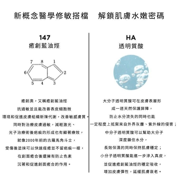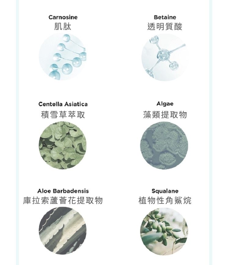 肌膚屏障增強: 含有水解玻尿酸和玻尿酸,可增強皮膚屏障,並促進水分輸送至更深層的皮膚層