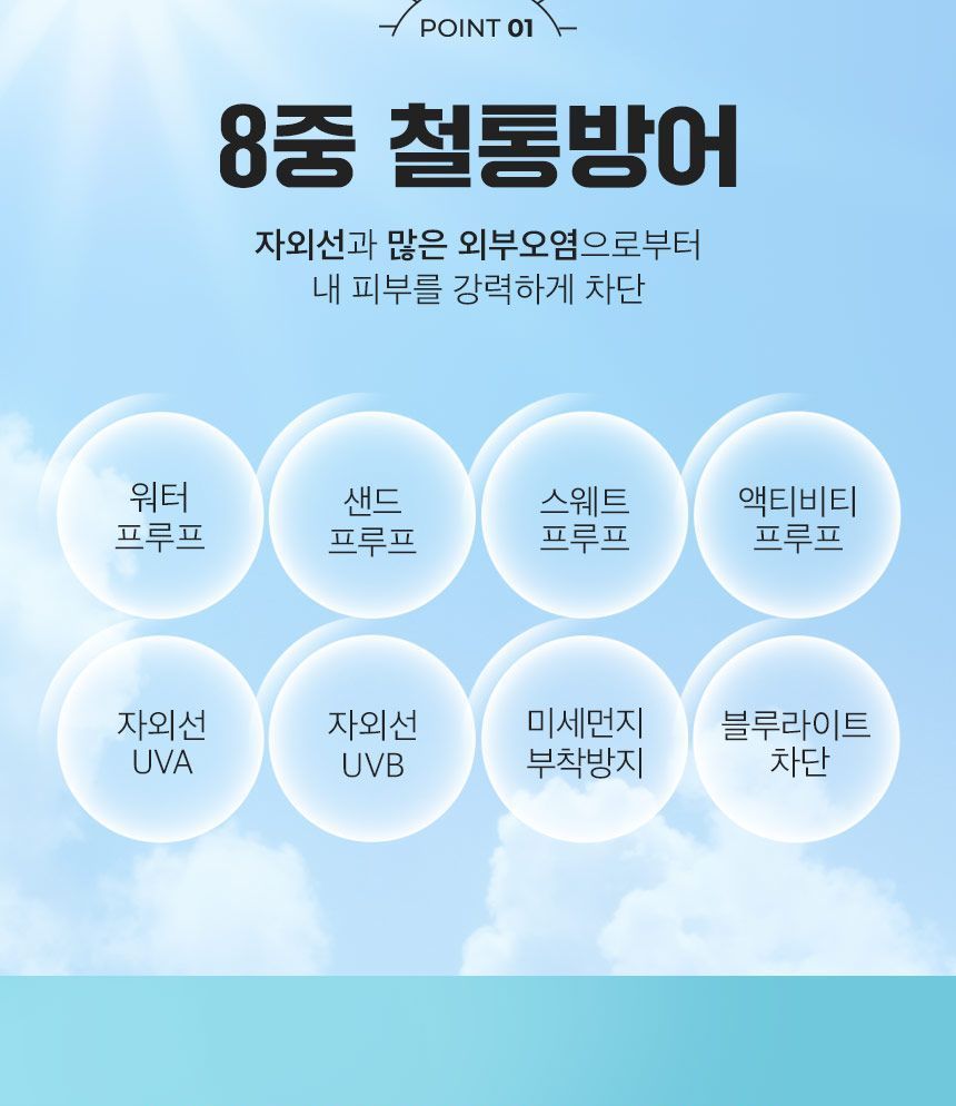 具備8重防護功效:UVA、UVB、防水、防沙、防汗、防活動、防細塵、防藍光,完美保護肌膚免受各種外界刺激。