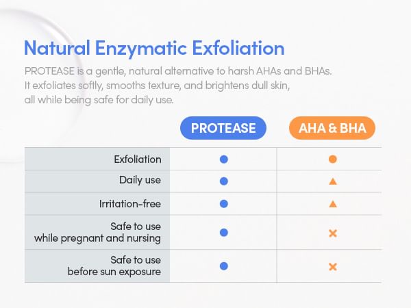 - 溫和去角質:不使用刺激性的化學去角質成分如果酸(AHA)和水楊酸(BHA),而是採用天然來源的蛋白酶(plant-derived enzyme)來溫和代謝老廢角質,減少對肌膚的刺激。