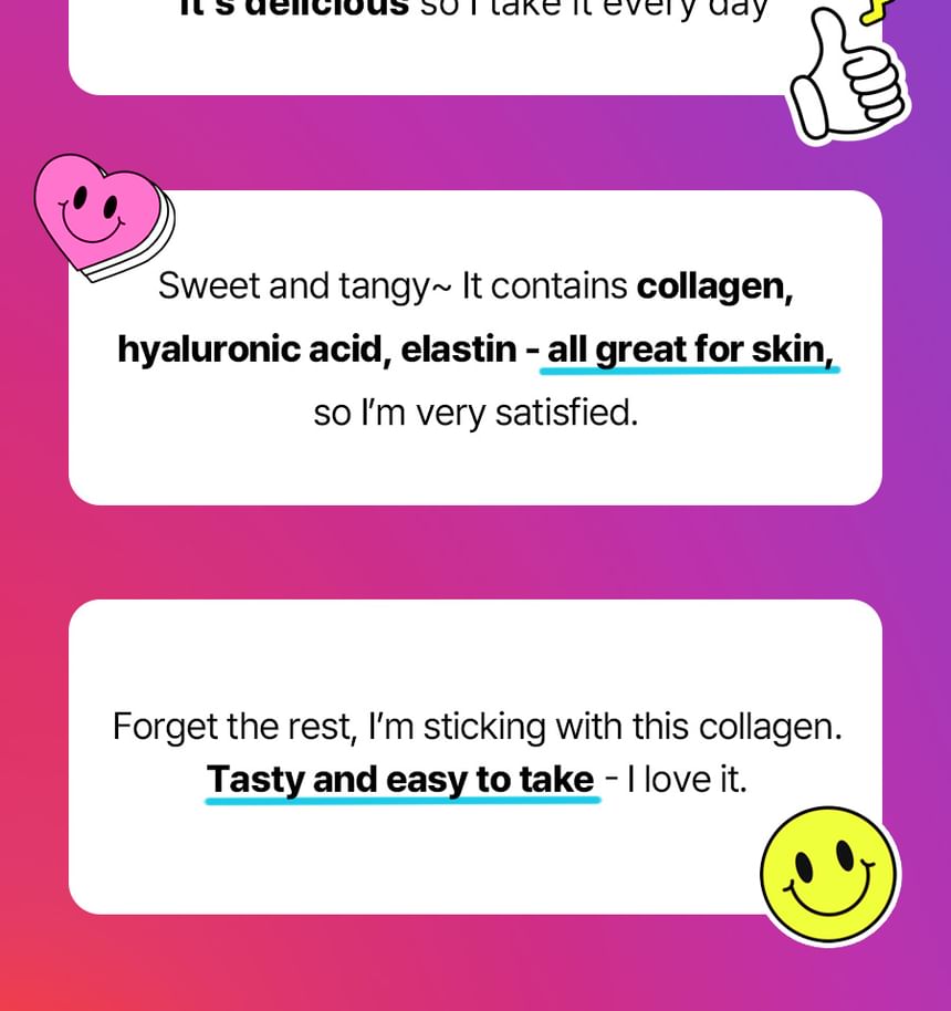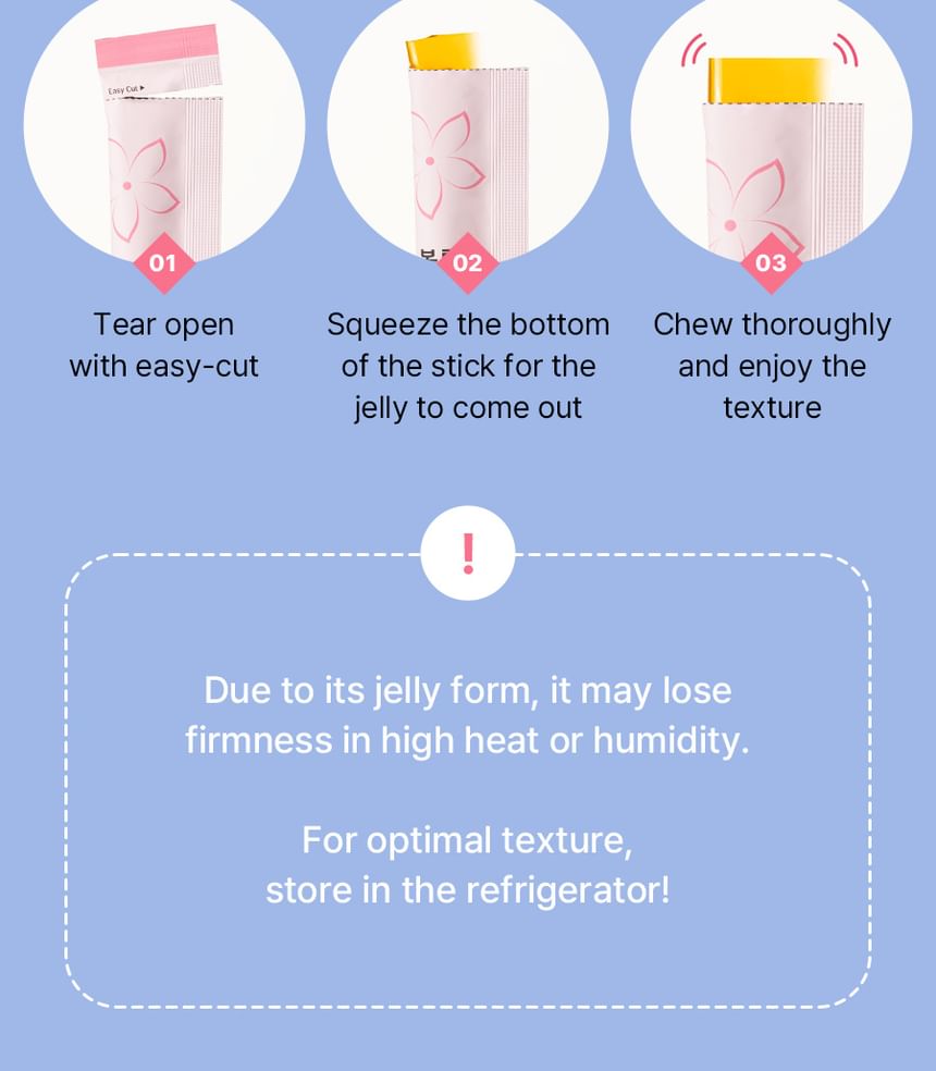 來自韓國品牌的膠原蛋白果凍補充品,專為提升肌膚彈性、保濕與抗老化而設計。它採用方便的棒狀包裝,每盒含有14包(每包15g),風味清新水果味,便於日常攜帶與食用。