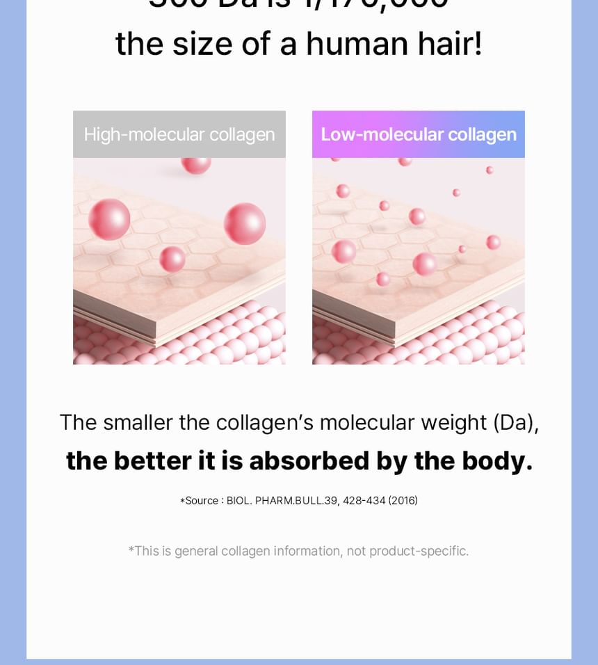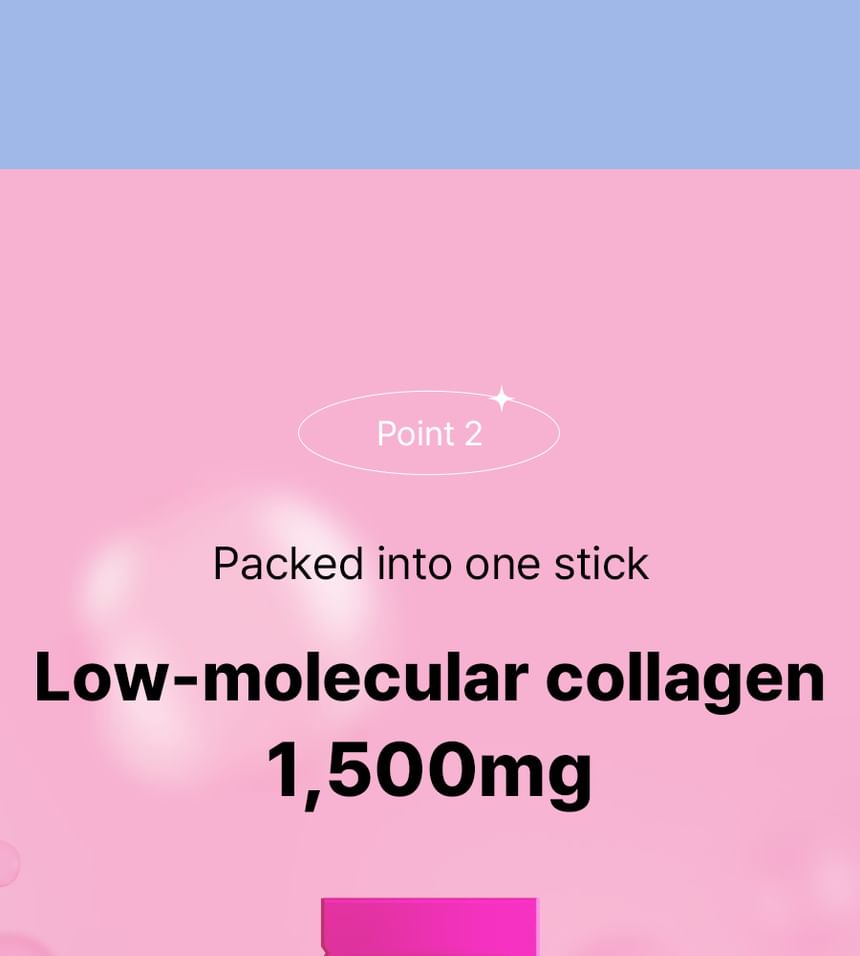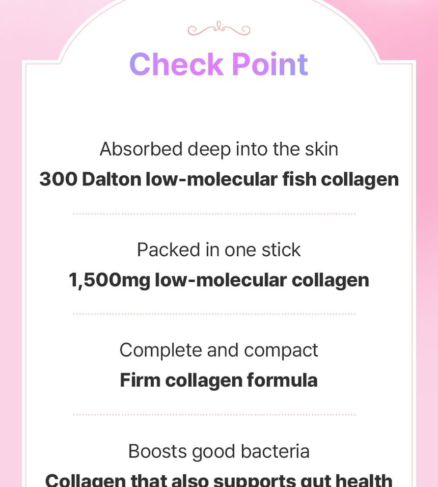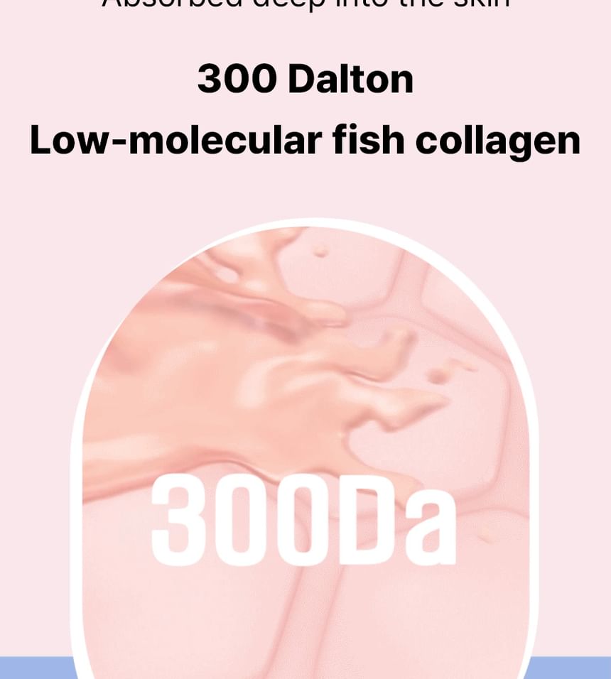 - 低分子魚膠原蛋白:每包含有1,500mg 的300Da低分子魚膠原蛋白,吸收率高,有助於促進體內天然膠原蛋白生成,減少皺紋與老化跡象,提升肌膚整體品質。