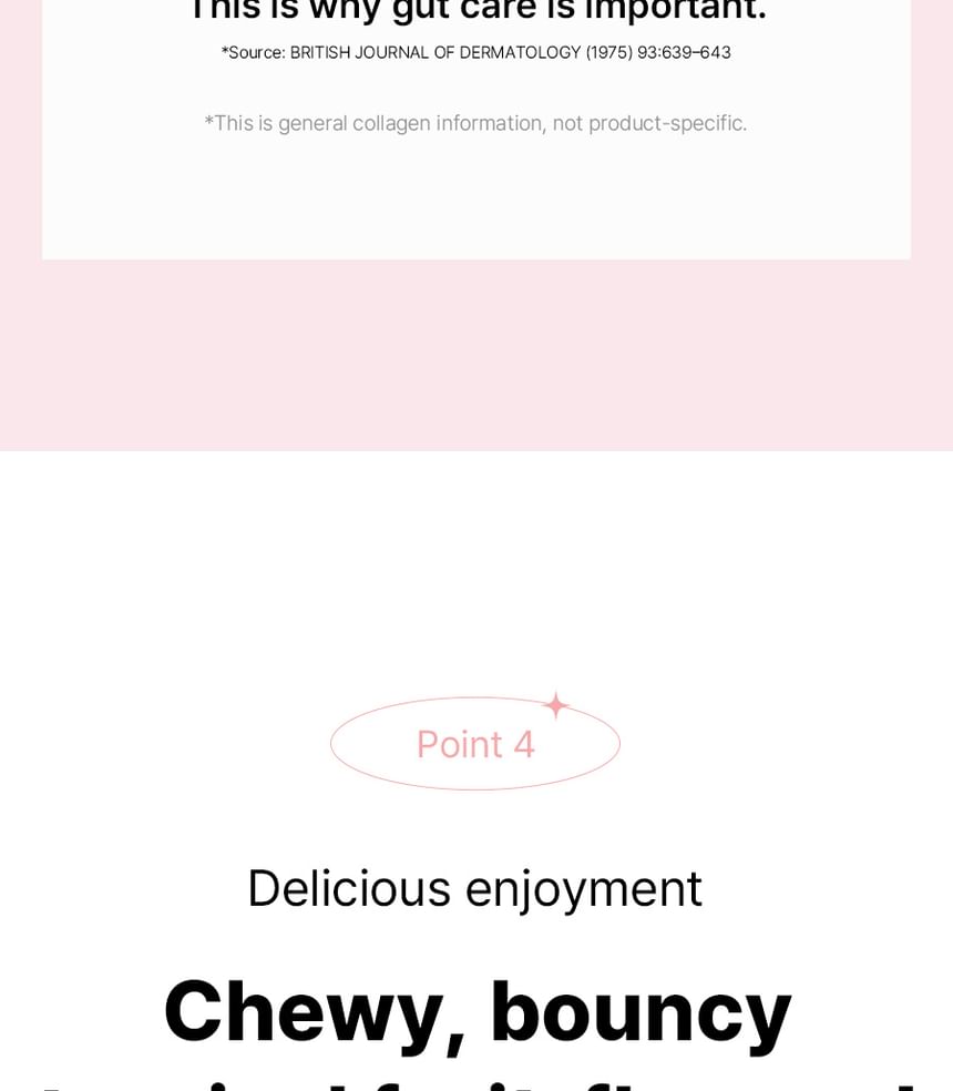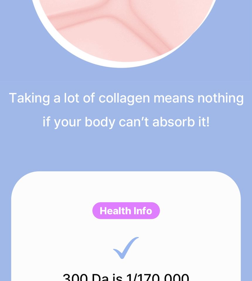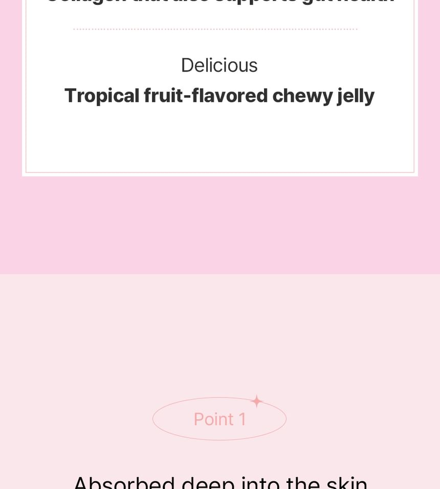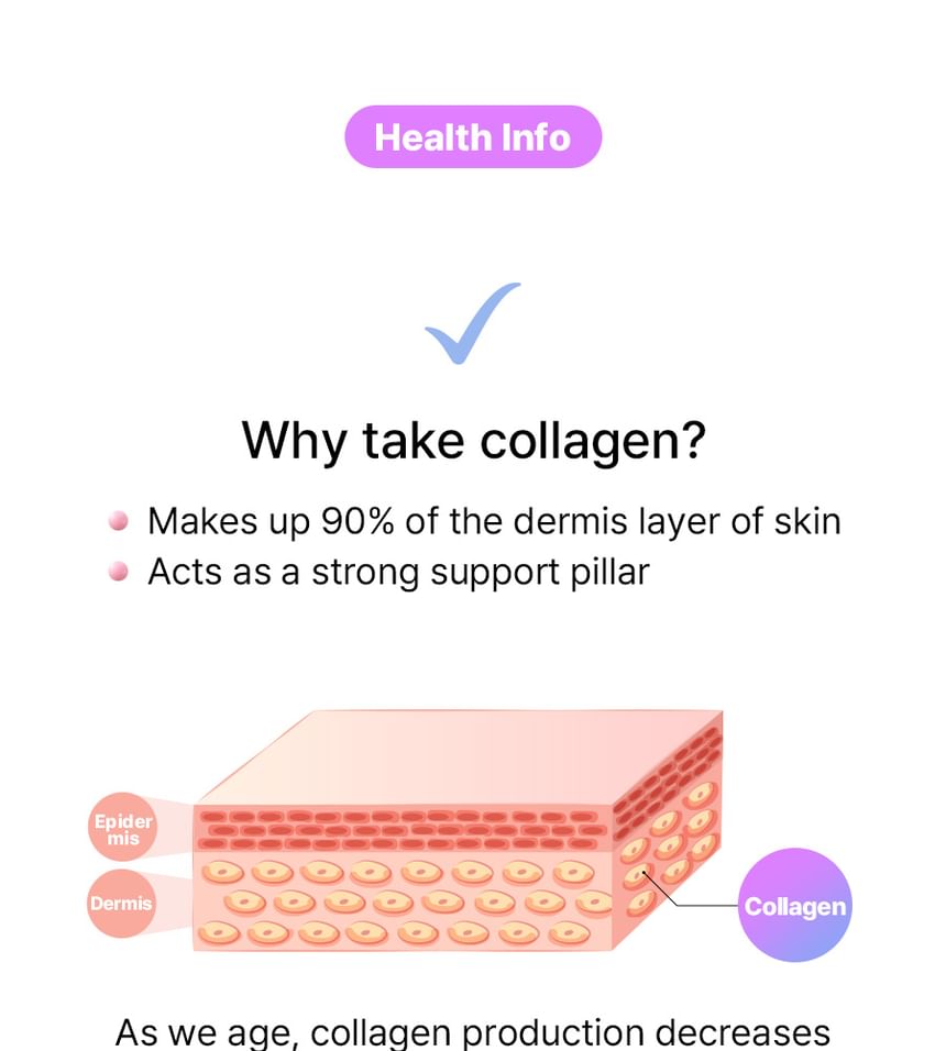 - 低分子魚膠原蛋白:每包含有1,500mg 的300Da低分子魚膠原蛋白,吸收率高,有助於促進體內天然膠原蛋白生成,減少皺紋與老化跡象,提升肌膚整體品質。