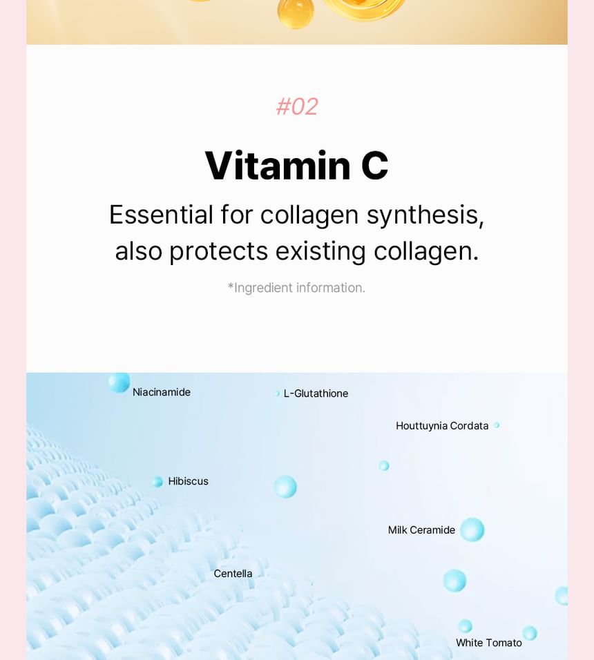- 7種協同成分:芙蓉花(hibiscus)、L-穀胱甘肽(L-glutathione)、癒創木犀(wood betony)、白番茄(white tomato)、積雪草萃取(centella extract)、菸鹼酸(niacin)與牛奶神經醯胺(milk ceramide),提供全面肌膚護理,支持抗氧化與修護。