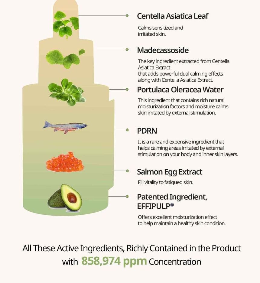 蘊含PDRN、鮭魚卵萃取物和積雪草葉水,可舒緩肌膚。