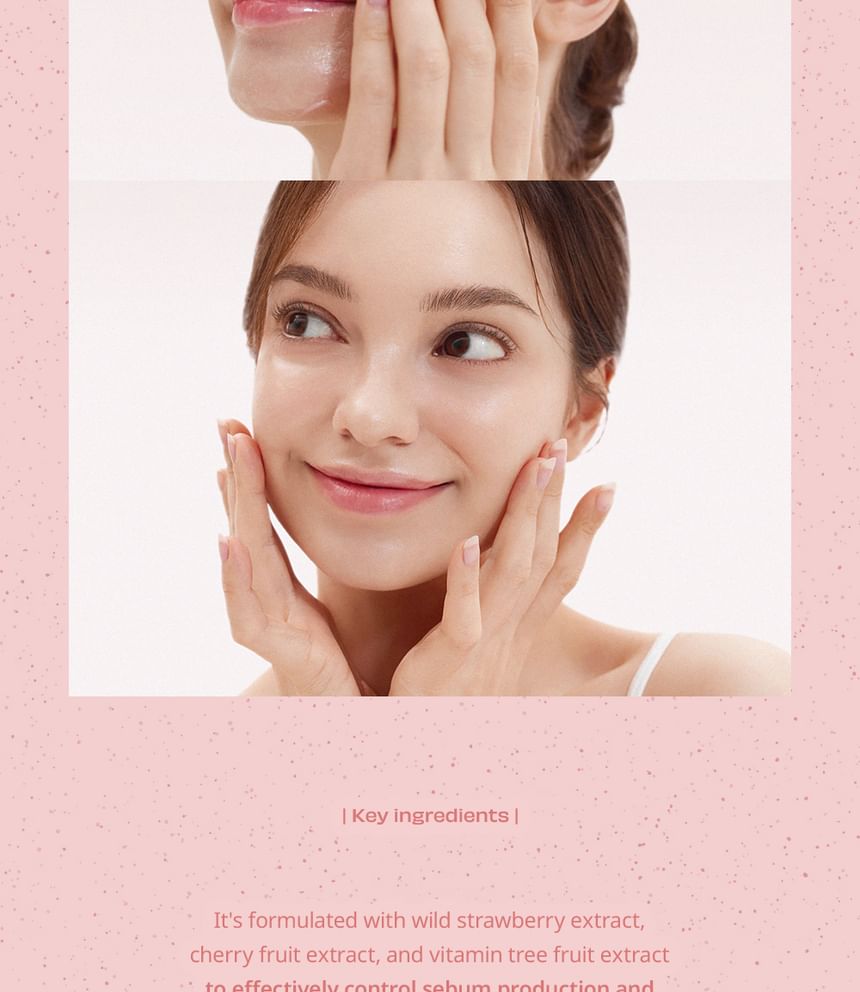 • 富含草莓萃取物、櫻桃果萃取物和維生素樹果萃取物,可控制皮脂分泌並維持皮膚的水油平衡。
